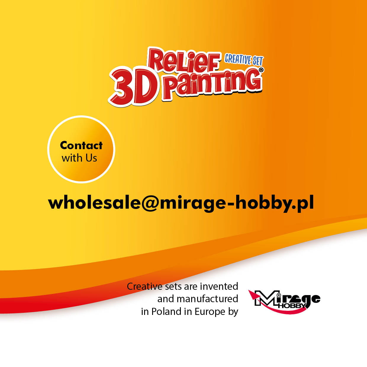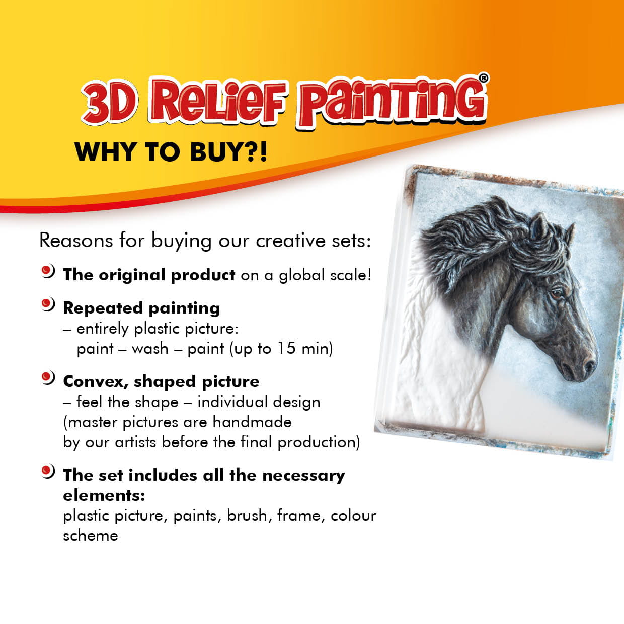 The set includes all the necessary elements: plastic 3D picture, paints, brush, frame, colour scheme