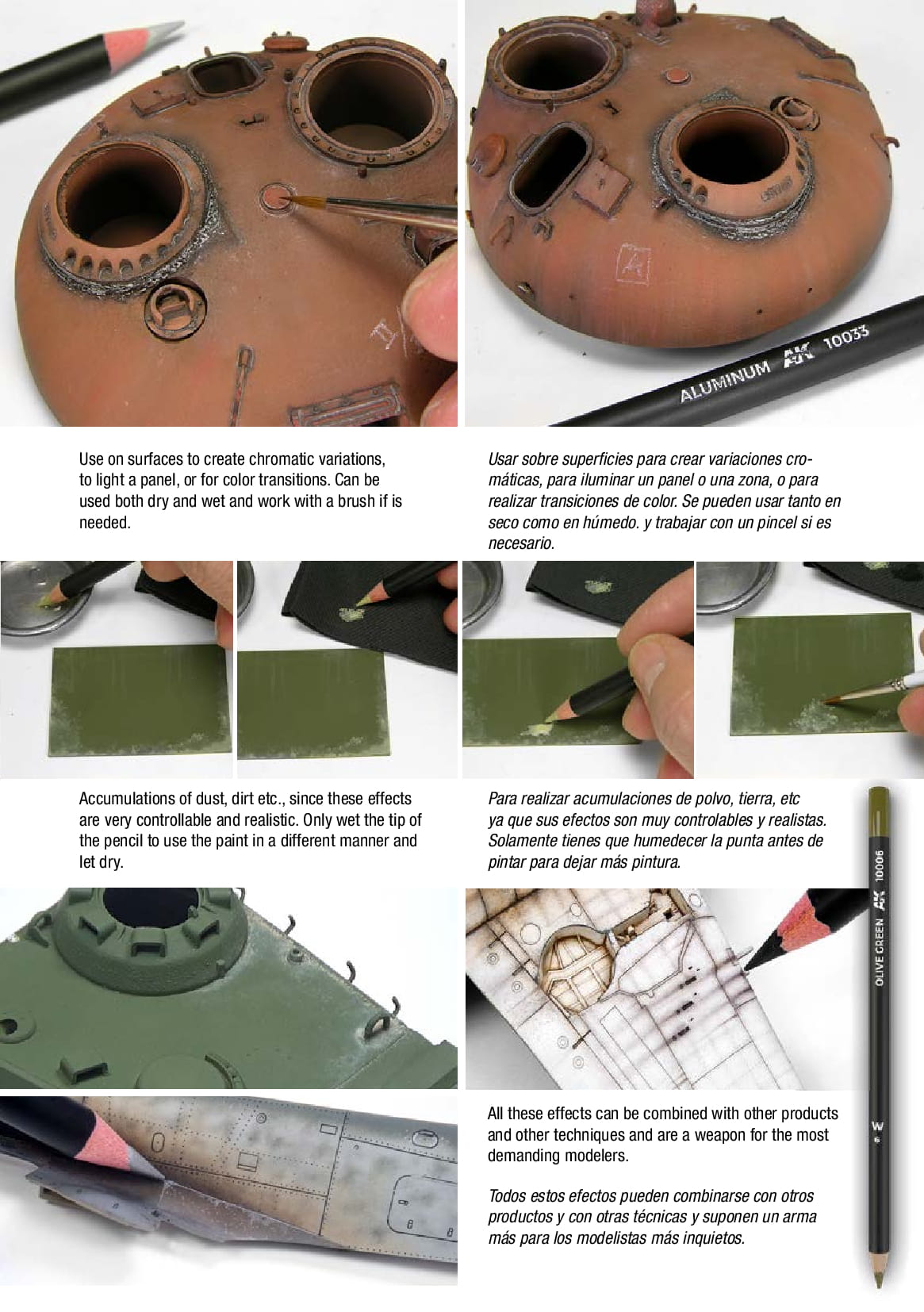 Kredki wodne z farbą to łatwy i precyzyjny sposób wykonywania różnych efektów weatheringu; mogą być nakładane na sucho, w zależności od potrzeb można korygować i rozmywać efekt na powierzchni modelu poprzez przemywanie pędzelkiem zwilżonym wodą. Dla najlepszych rezultatów producent zaleca nakładanie na matowych powierzchniach.