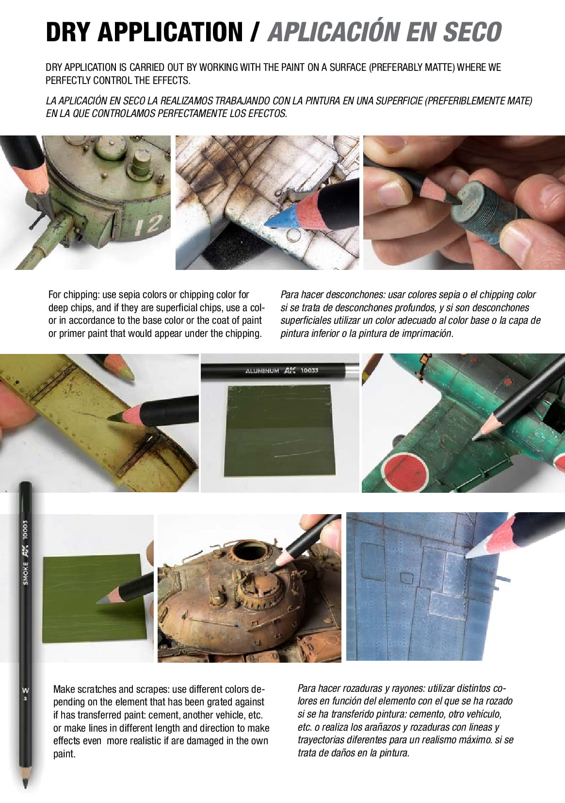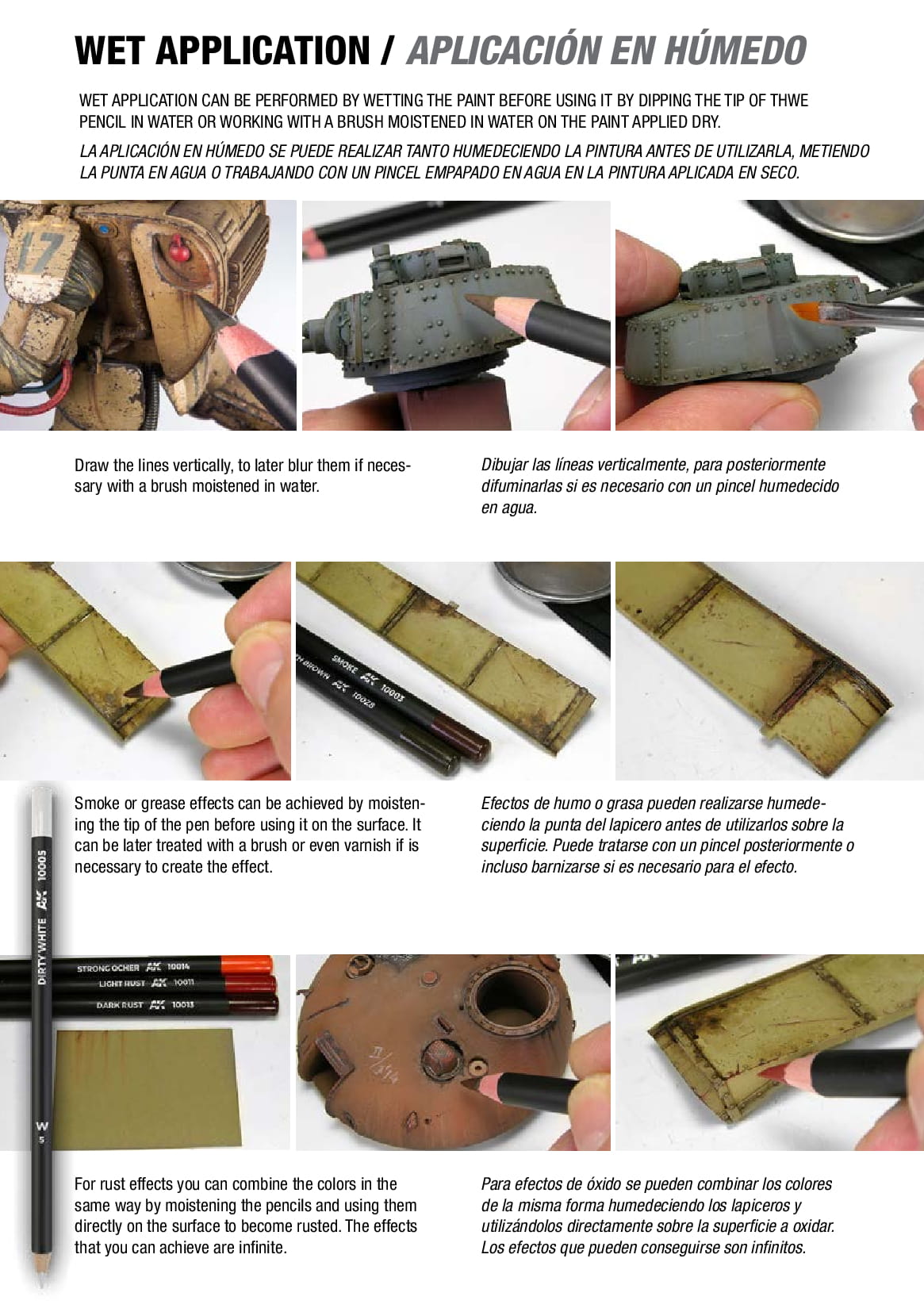 Kredki wodne z farbą to łatwy i precyzyjny sposób wykonywania różnych efektów weatheringu; mogą być nakładane na sucho, w zależności od potrzeb można korygować i rozmywać efekt na powierzchni modelu poprzez przemywanie pędzelkiem zwilżonym wodą. Dla najlepszych rezultatów producent zaleca nakładanie na matowych powierzchniach.