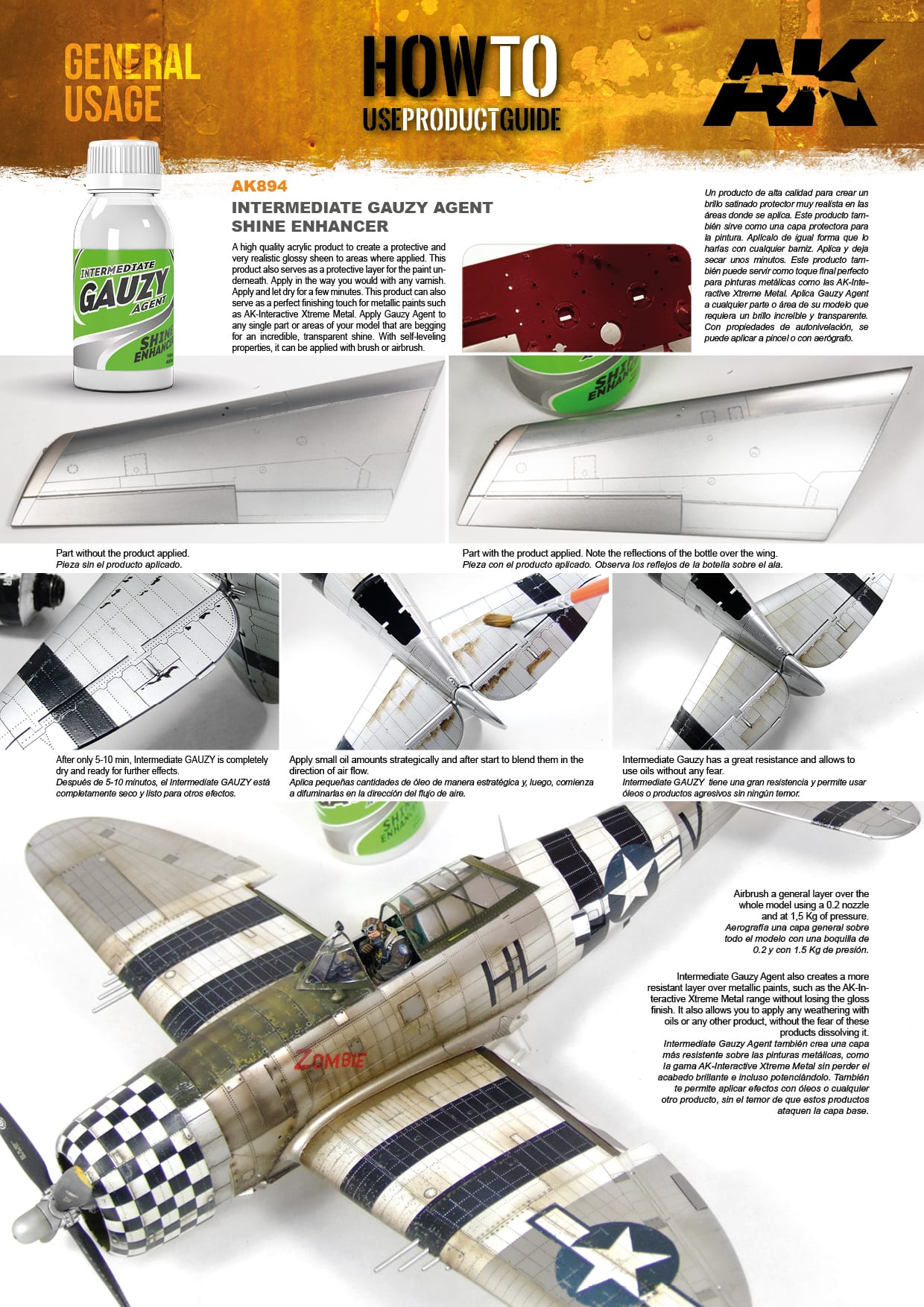 Zastosuj i pozostaw do wyschnięcia na kilka minut. Produkt ten może również służyć jako doskonałe wykończenie lakierów metalicznych, takich jak AK Interactive Xtreme Metal. Zastosuj Gauzy Agent do dowolnej części lub sekcji modelu, które proszą o niesamowity przezroczysty połysk. Dzięki właściwościom samopoziomującym można go nakładać pędzlem lub aerografem.