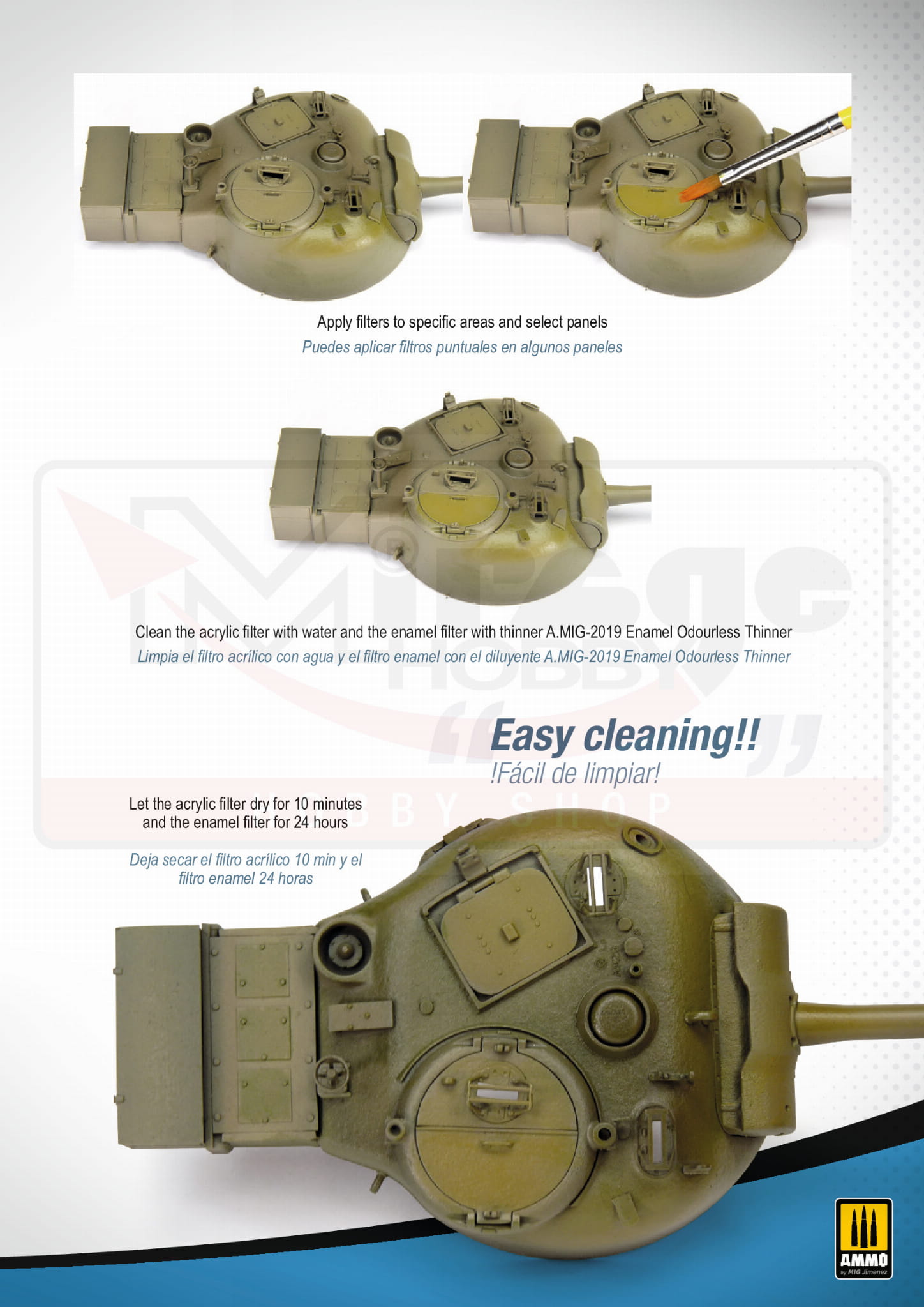 Filtry akrylowe można rozcieńczać i czyścić wodą, rozcieńczalnikiem do akrylu AMMO 2000 lub zmywaczem AMMO 2001.