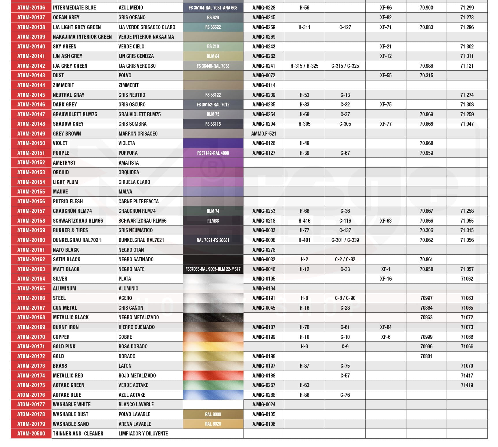 Gama farb Ammo ATOM obejmuje 180 kolorów obejmujących bardzo szeroki zakres chromatyczny, od kolorów podstawowych, jasnych i intensywnych, po kolory metaliczne i zmywalne. Zawiera również specjalnie opracowany rozcieńczalnik dla całego asortymentu. Ponadto gama ATOM obejmuje również historycznie dokładne kolory zarówno dla schematów kamuflażu samolotów, jak i opancerzonych pojazdów bojowych.