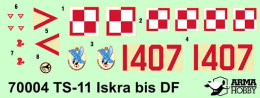 - Kalkomania dla 1 wersji kolorystycznej: TS-11 Iskra bis DF, nt 3H-1407, 10 Eskadra Lotnictwa Taktycznego, Łask 2006