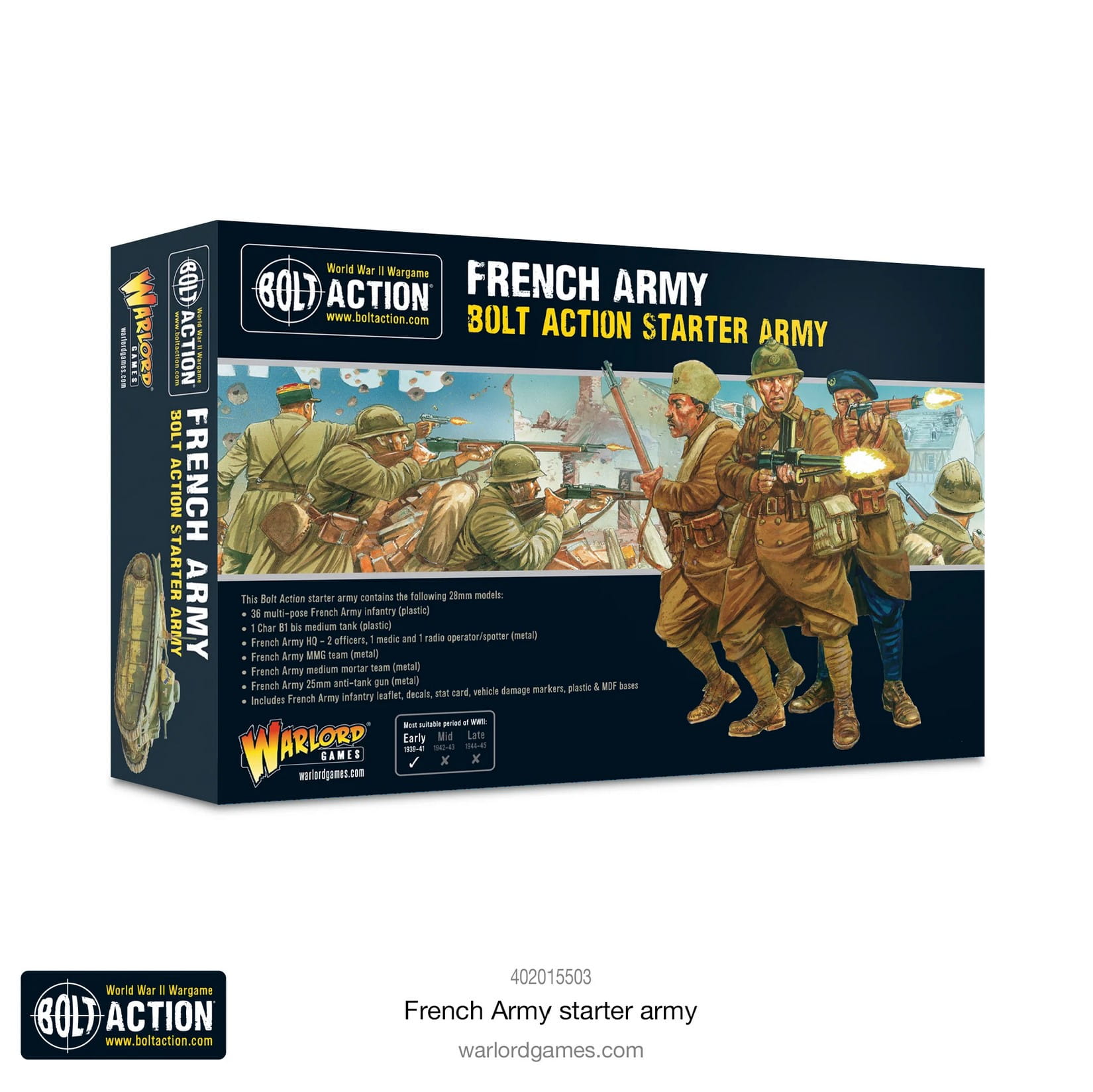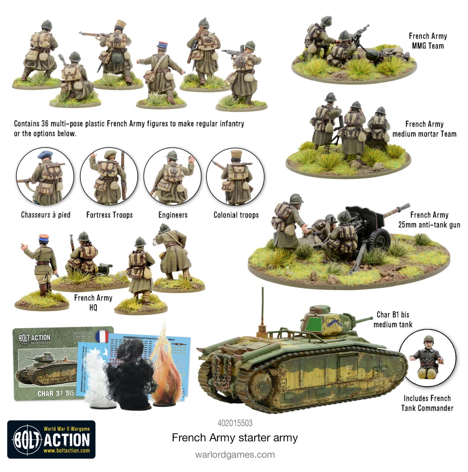 Średni moździerz, średni karabin maszynowy i działo przeciwpancerne 25 mm zapewniają dodatkową siłę ognia tym odważnym synom Francji, podczas gdy wsparcie pancerne zapewnia czołg średni Char B1 bis. Wszechstronna gama Bolt Action obejmuje dodatkowych żołnierzy i pojazdy, które możesz dodać do swojej armii, gdy będziesz gotowy na powiększenie swoich francuskich sił.