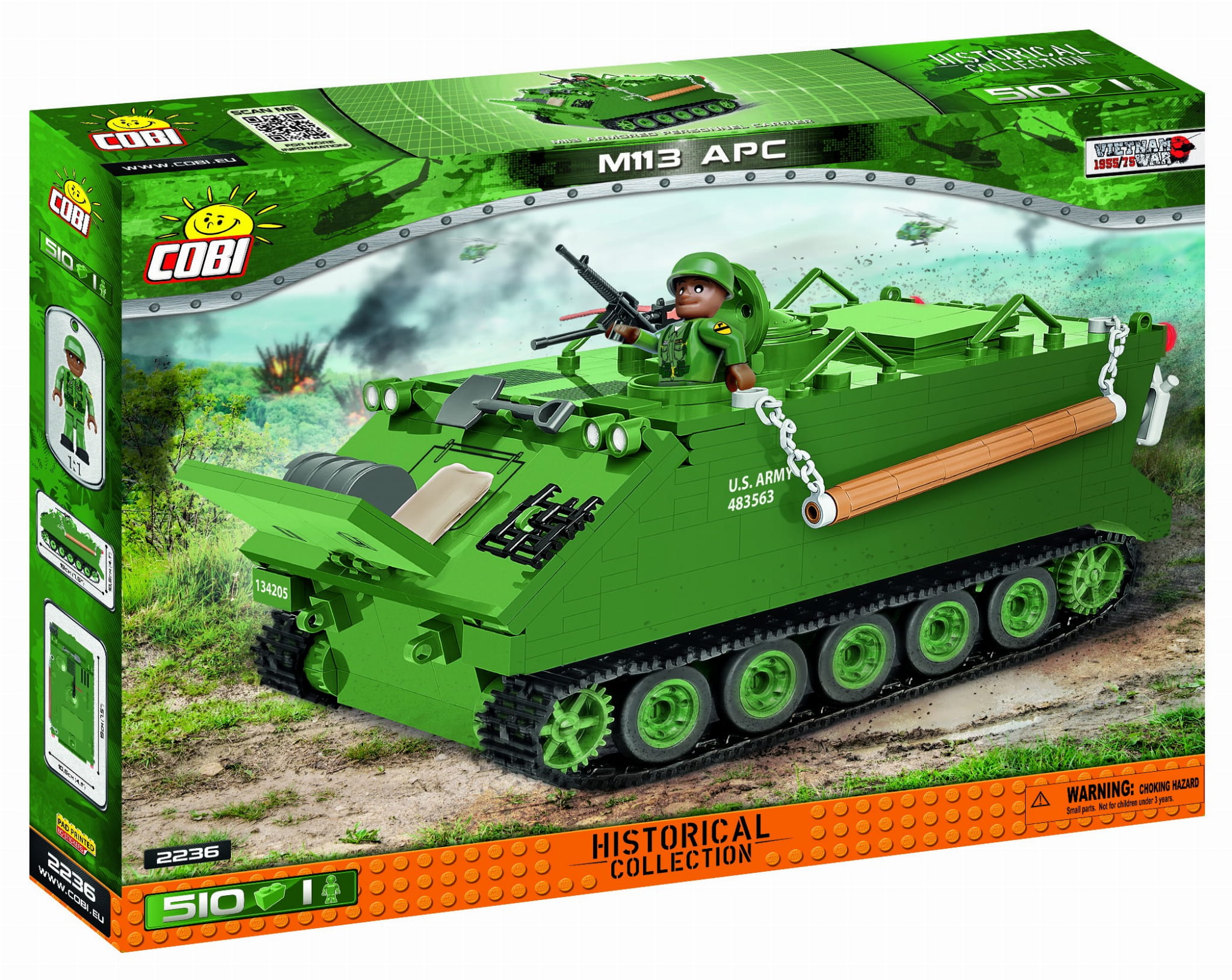 Klocki konstrukcyjne COBI to wysokiej jakości bezpieczny produkt polski w całości wytworzony w naszej mieleckiej fabryce. M113 to niezwykle popularny i rozpowszechniony na całym świecie amerykański transporter opancerzony. Został wprowadzony do służby 1960 roku. Pancerz M113 wykonano z płyt aluminiowych, pozwoliło to obniżyć masę pojazdu. Pierwsze egzemplarze były napędzane silnikiem gaźnikowym. W wersji M113A1 zainstalowano silnik Diesla. Podwozie i kadłub M113 stały się podstawą do opracowania szeregu pojazdów o różnorodnym przeznaczeniu i uzbrojeniu. Chrzest bojowy przeszedł w czasie wojny wietnamskiej, gdzie z powodzeniem używano go do transportu ludzi oraz zaopatrzenia. Do momentu wprowadzenia do służby owego bojowego wozu piechoty o nazwie M2 Bradley - M113 był podstawowym pojazdem amerykańskiej piechoty zmechanizowanej. Później jego rola stopniowo się zmniejszała. Pojazd nadal pozostaje w służbie wielu armii na całym świecie. W 2003 roku Niemcy przekazali Polsce 35 transporterów z rodziny M113. Do dzisiaj służą one w 10. Brygadzie Kawalerii Pancernej.