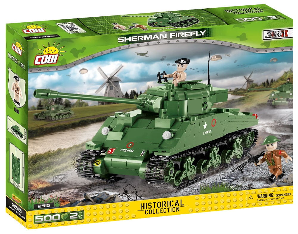 Model czołgu Sherman Firefly z klocków konstrukcyjnych COBI został zaprojektowany z ogromną dbałością o detale i wierne odwzorowanie rzeczywistej konstrukcji. Posiada trwałe nadruki odpowiadające historycznym oznaczeniom używanym przez 1. Dywizję Pancerną gen. Maczka. Pojazd z pewnością zachwyci wszystkich kolekcjonerów oraz miłośników broni pancernej, militariów i historii. Dzięki ruchomym elementom takim jak: otwierane włazy, koła i gąsienice, wieża, którą można obracać oraz lufa, którą można podnosić i opuszczać, czołg sprawdzi się jako znakomita zabawka dla najmłodszych. W zestawie dostępne są również dwie figurki: polski dowódca czołgu z lornetką i żołnierz piechoty w brytyjskim mundurze z polskimi oznaczeniami, uzbrojony w karabin maszynowy Bren. Klocki COBI są w pełni kompatybilne z innymi markami klocków konstrukcyjnych.