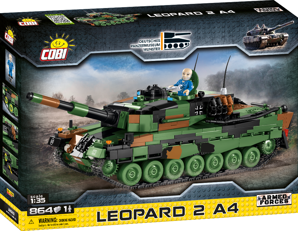 Model czołgu Leopard 2A4 stworzony z klocków konstrukcyjnych COBI został wiernie odwzorowany na podstawie swego rzeczywistego odpowiednika będącego w zbiorach niemieckiego muzeum Deutsches Panzermuseum Munster. Ruchome elementy takie jak: wieża i lufa czołgu, obracające się koła i gąsienice oraz otwierane włazy, pozwalają na znakomitą zabawę dla wszystkich nawet najmłodszych fanów militariów. Odtworzony został również silnik czołgu do którego można zajrzeć otwierając klapę serwisową. Każdy dorosły pasjonat historii oraz broni pancernej na pewno z przyjemnością ozdobi swą kolekcję tym modelem. W zestawie dostępna jest również specjalna figurka przedstawiająca jednego z najbardziej zasłużonych pracowników Deutsches Panzermuseum Munster.