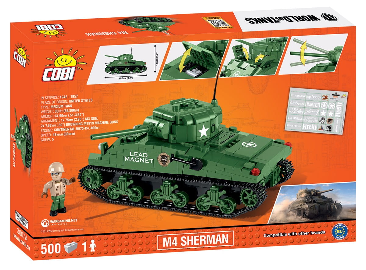 Miniaturowy pojazd z klocków konstrukcyjnych COBI posiada liczne ruchome części takie jak otwierane włazy, ruchomy karabin maszynowy, czy obracające się koła i gąsienice. Wieżę czołgu wraz z opuszczaną i podnoszoną lufą działa, można obracać. W tylnym pancerzu zainstalowany jest właz techniczny, który można otworzyć, by zobaczyć atrapę silnika. Wielką zaletą pojazdu jest także bardzo solidna konstrukcja, która wiernie odzwierciedla oryginalne kształty swego historycznego pierwowzoru. Model czołgu Sherman M4 to świetna zabawka, ale także szczególny element każdej kolekcji fana militariów i broni pancernej oraz gry wideo World of Tanks. W zestawie jest dostępna figurka czołgisty oraz arkusz naklejek z symbolami i oznaczeniami wojskowymi. Pojazd jest odświeżoną i poprawioną wersją bestsellerowego modelu oznaczonego numerem (3007). Zawiera nowe kształty klocków i rozwiązania konstrukcyjne, w tym: zwężoną i obniżoną konstrukcje, nowe zmniejszone klocki imitujące boczne wózki jezdne, zupełnie nową konstrukcję wieży oraz kompletnie przebudowany tylny pancerz (edycja luty 2019).