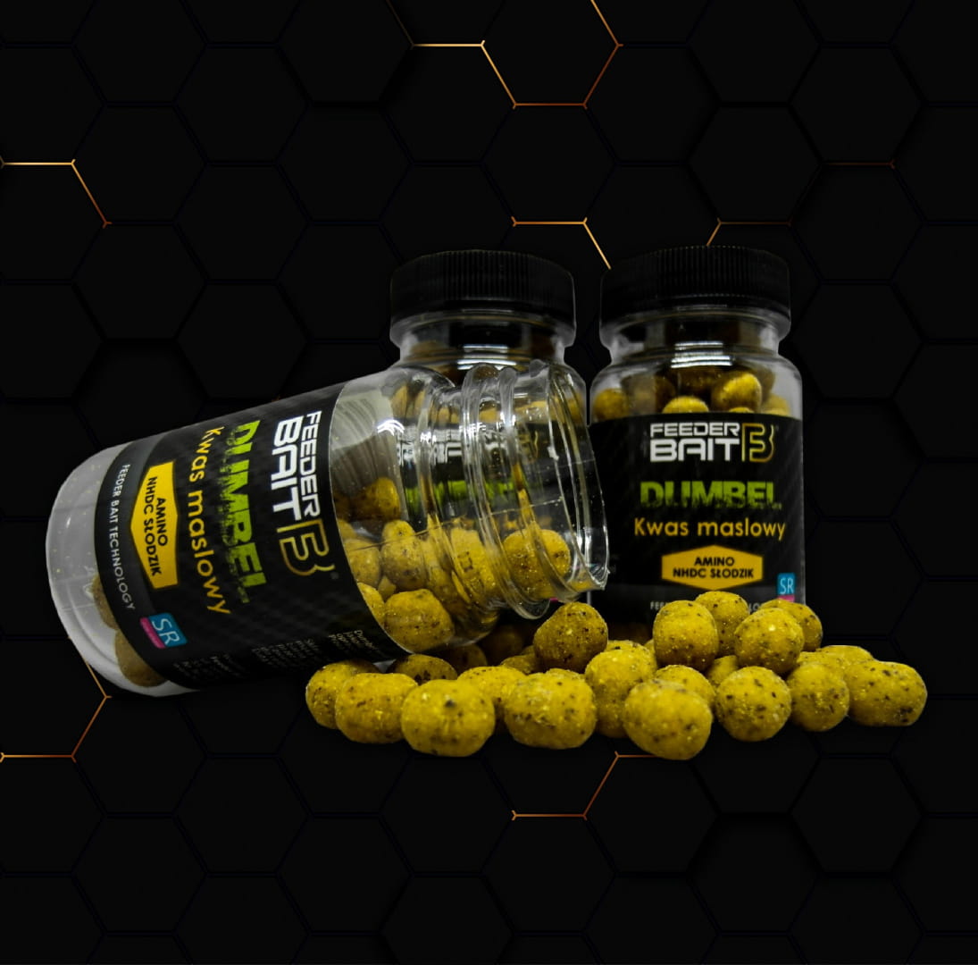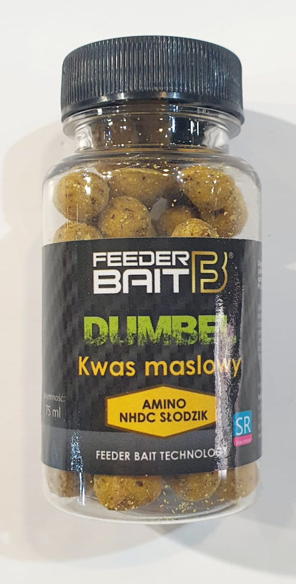 Technologia Feeder Bait SR - slow release informuje o powolnym uwalnianiu zawartych w dumbel aminokwasów oraz słodzika NHDC. Długim i żmudnym procesem okazało się osiągnięcie takiego połączenia ale było warto, gdyż podczas testów Dumbel Feeder Bait udowodnił wyższość nad innymi przynętami.