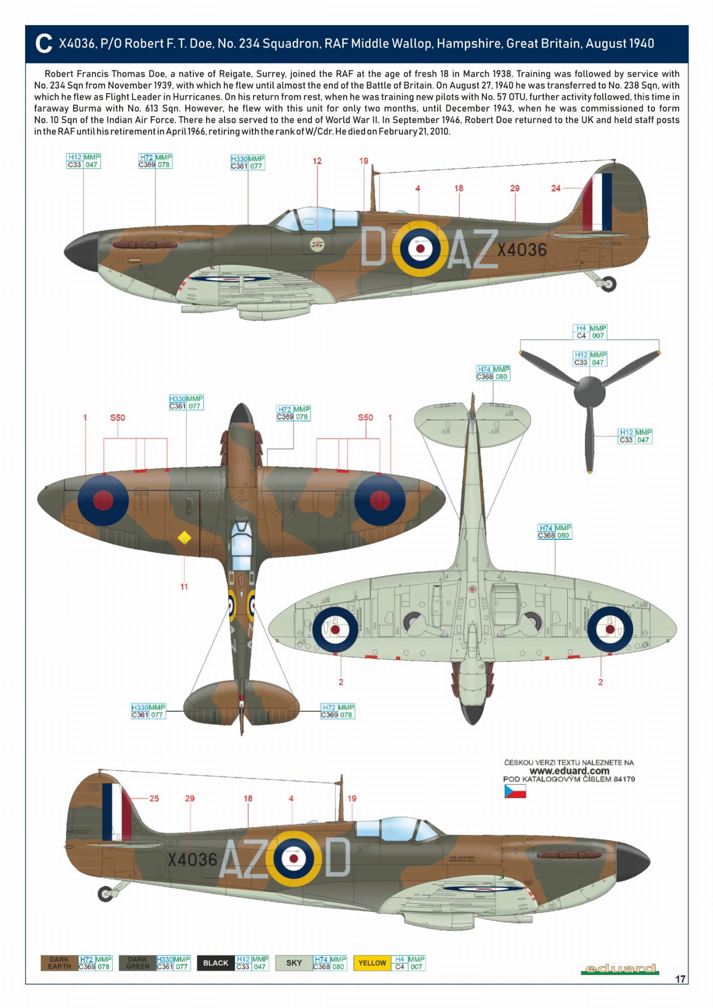 - Spitfire Mk. Ia 1/48 - X4036, P/O Robert F. T. Doe, 234 Squadron, RAF Middle Wallop, Hampshire, Wielka Brytania, sierpień 1940