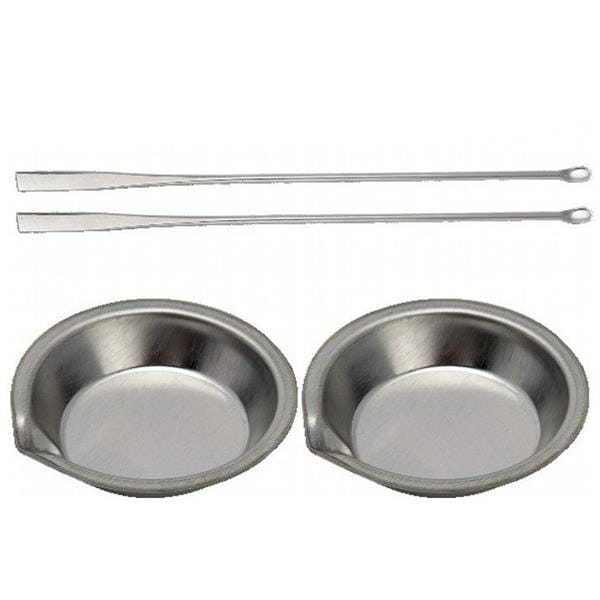 Zestaw do mieszania farb, który zawiera dwie miski i dwa mieszadła ze stali nierdzewnej.