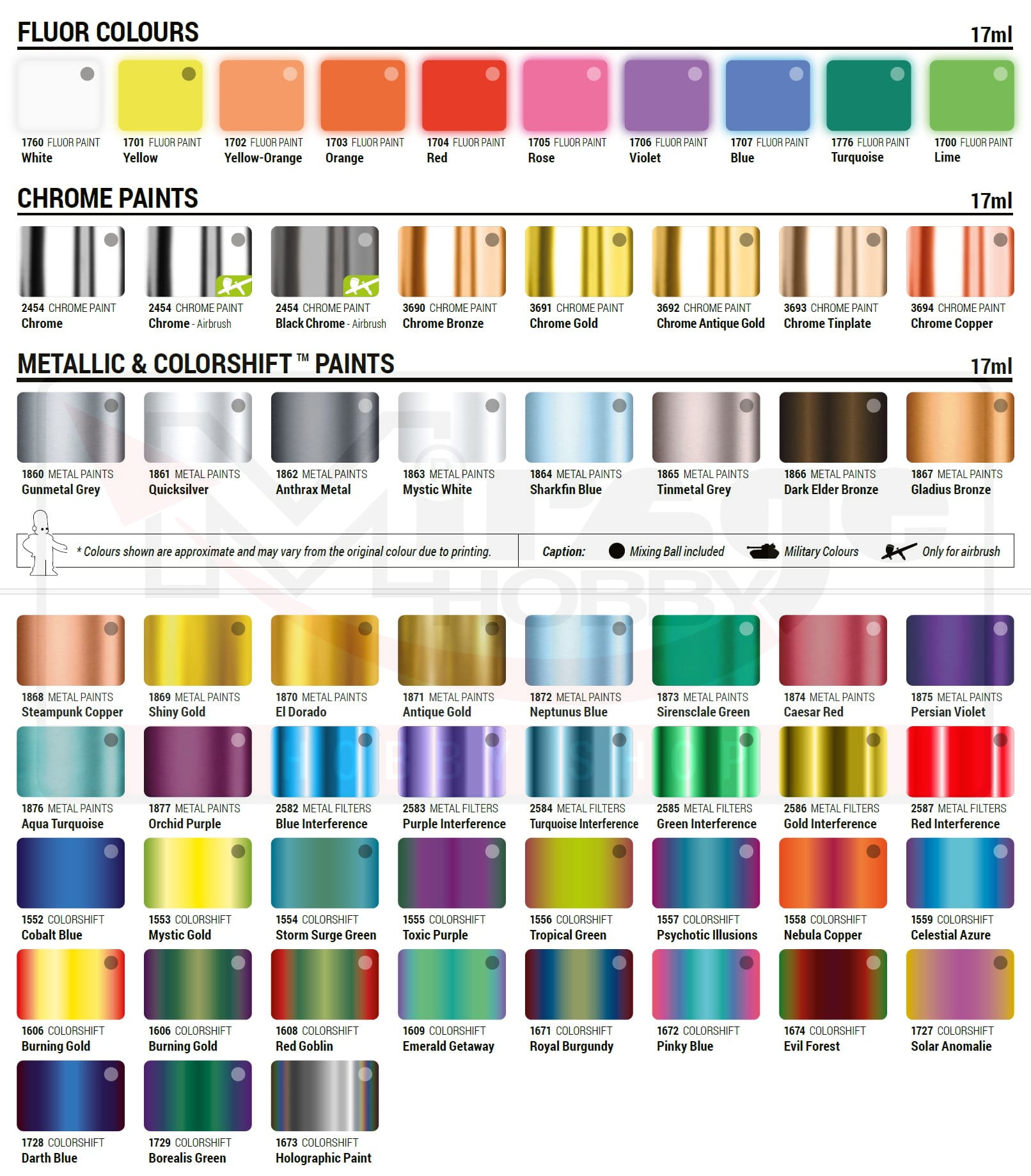Dzięki pełnemu spektrum podstawowych tonów i odcieni niezbędnych w grach wojennych, pojazdach, miniaturach i dioramach, a także unikalnym kolorom dostępnym wyłącznie dla GSW, ta seria ma na celu zapewnienie wszystkiego, czego hobbysta potrzebuje do swoich projektów.