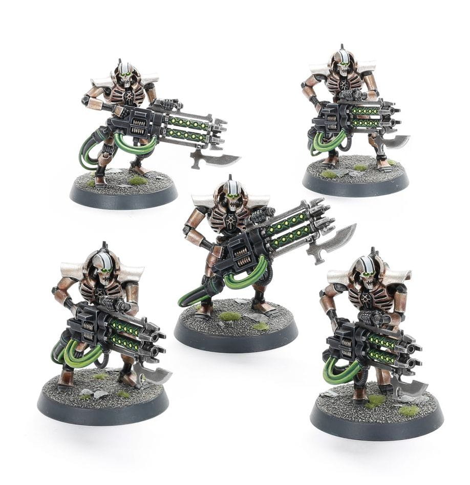 Zestaw zawiera: 5 modeli które można złożyć jako Necron immortals lub Deathmarks wraz z uzbrojeniem do wyboru: gauss blasters lub tesla carabines oraz 5 podstawek 32 mm.