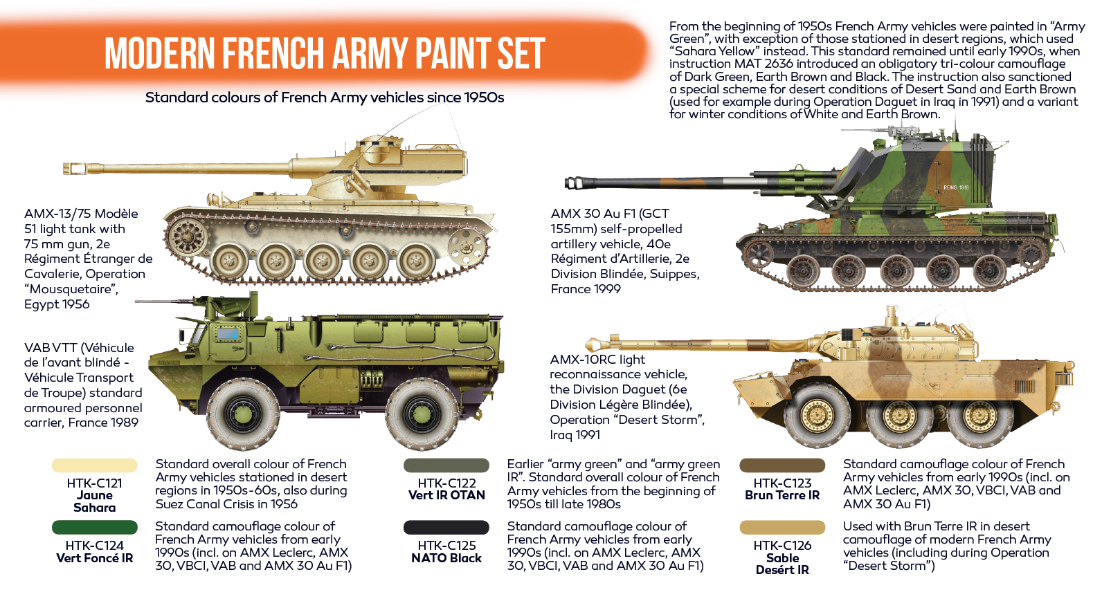 Zestaw zawiera farby emaliowe wyprodukowane przez firmę Hataka przeznaczone do malowania modeli francuskich pojazdów pancernych pochodzących z okresu po 1945 roku.