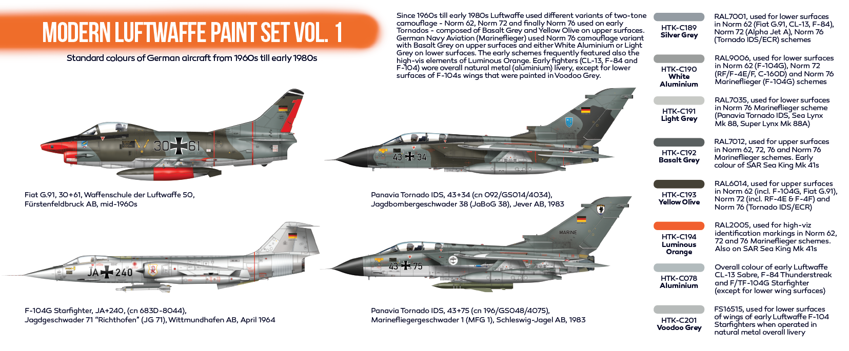 Zestaw zawiera farby emaliowe wyprodukowane przez firmę Hataka przeznaczone do malowania modeli niemieckich samolotów i helikopterów pochodzących z okresu po 1945 roku.