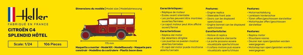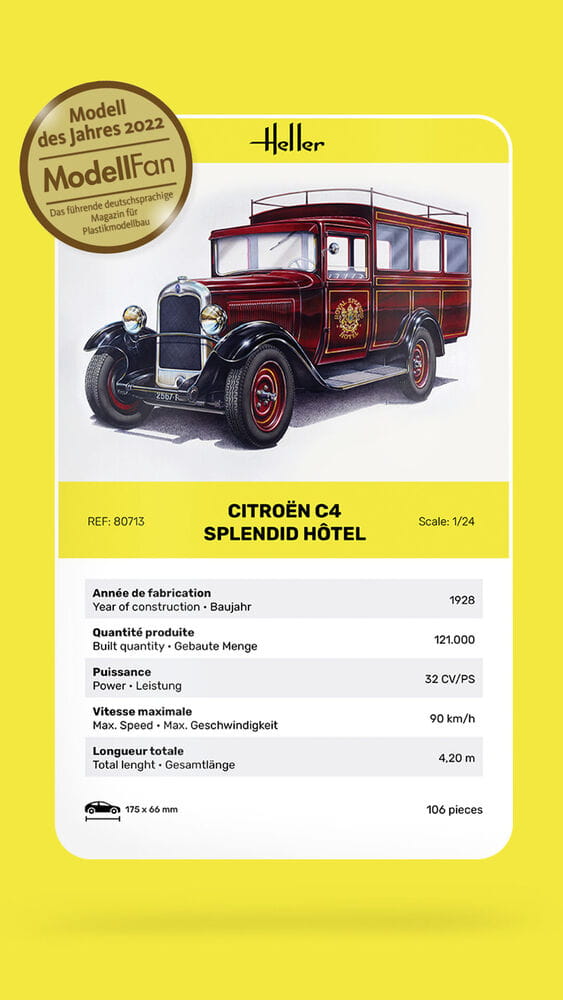 Designed using a new technique at the time and inspired by American manufacturing processes, the C4 was an exceptionally sturdy vehicle. Heller‘s model depicts the type of vehicles commonly used in the 20s and 30s by high-end establishment to carry their wealthy clients between the train station and the hotel.