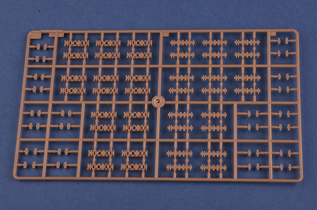 The track system used on the Tiger II chassis was a unique one, which used alternating "contact shoe" and "connector" links—the contact shoe link had a pair of transverse metal bars that contacted the ground, while the connector links had no contact with the ground.