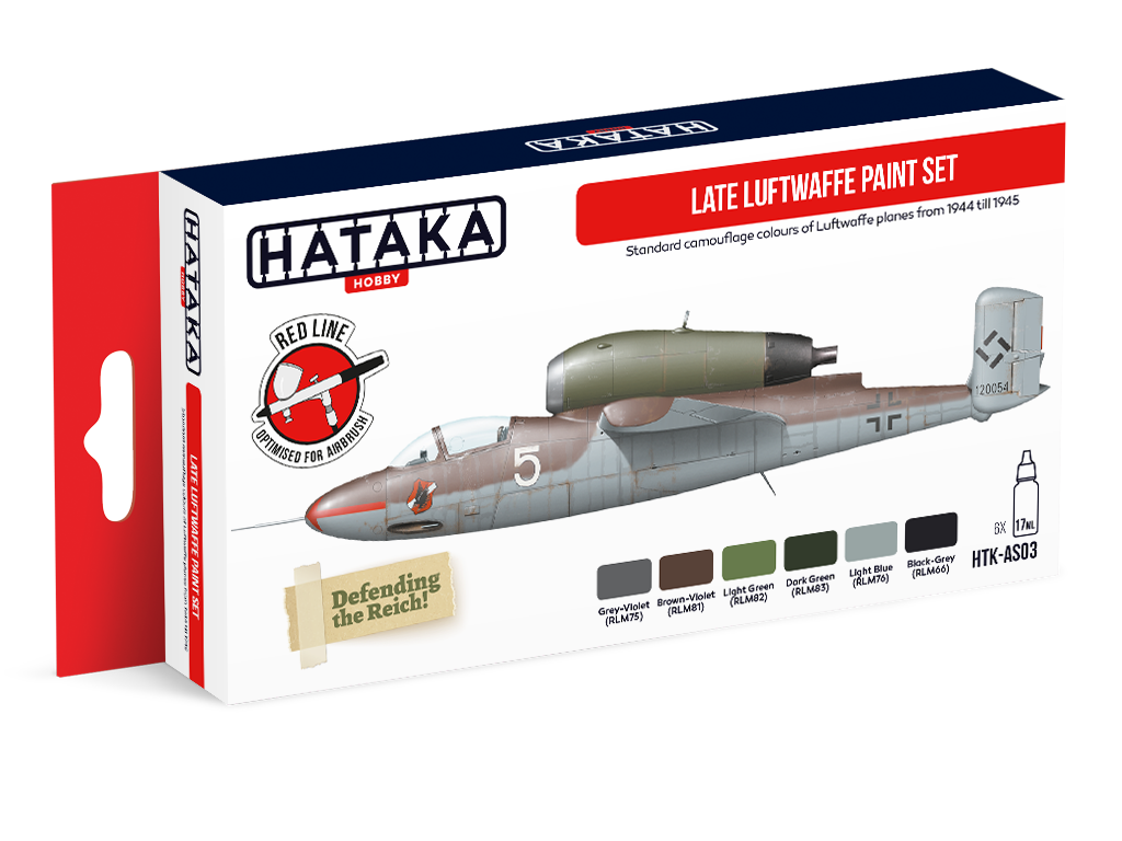 Zestaw zawiera farby akrylowe wyprodukowane przez firmę Hataka przeznaczone do malowania modeli niemieckich samolotów pochodzących z okresu II Wojny Światowej (1939 - 1945).