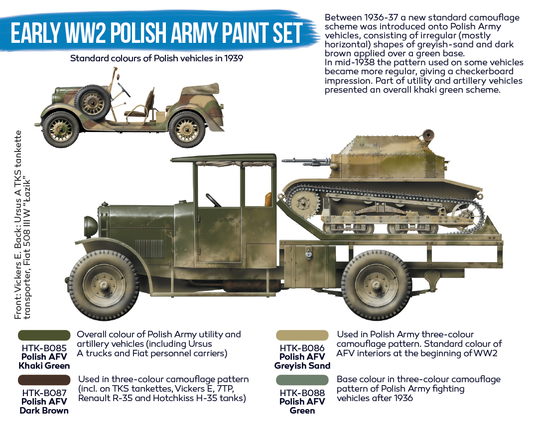 Zestaw zawiera farby akrylowe wyprodukowane przez firmę Hataka przeznaczone do malowania modeli polskich pojazdów pancernych pochodzących z okresu II Wojny Światowej (1939 - 1945).