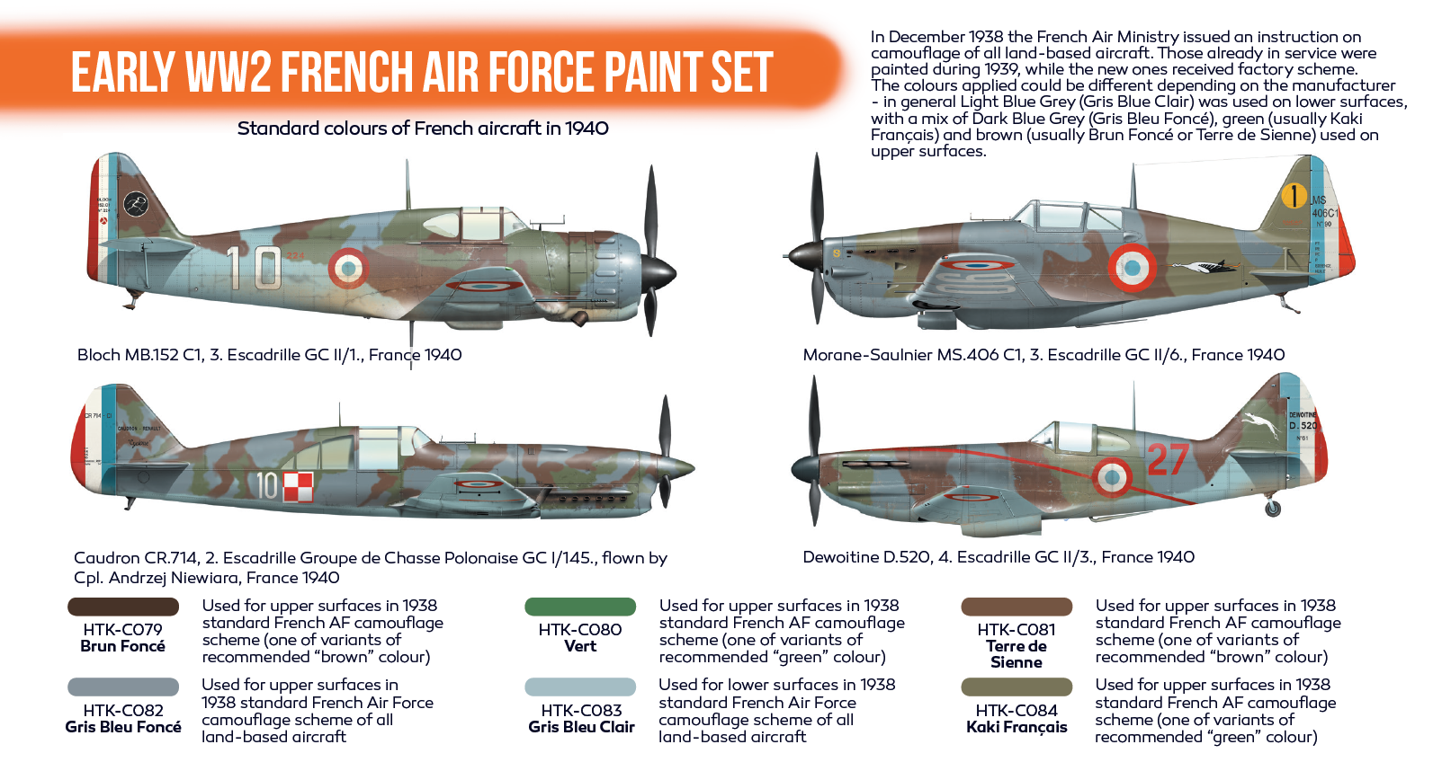 Zestaw zawiera farby emaliowe wyprodukowane przez firmę Hataka przeznaczone do malowania modeli francuskich samolotów pochodzących z okresu II Wojny Światowej (1939 - 1945).