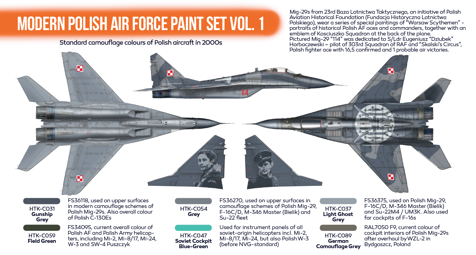 Zestaw zawiera farby emaliowe wyprodukowane przez firmę Hataka przeznaczone do malowania modeli polskich samolotów i helikopterów pochodzących z okresu po 1945 roku.