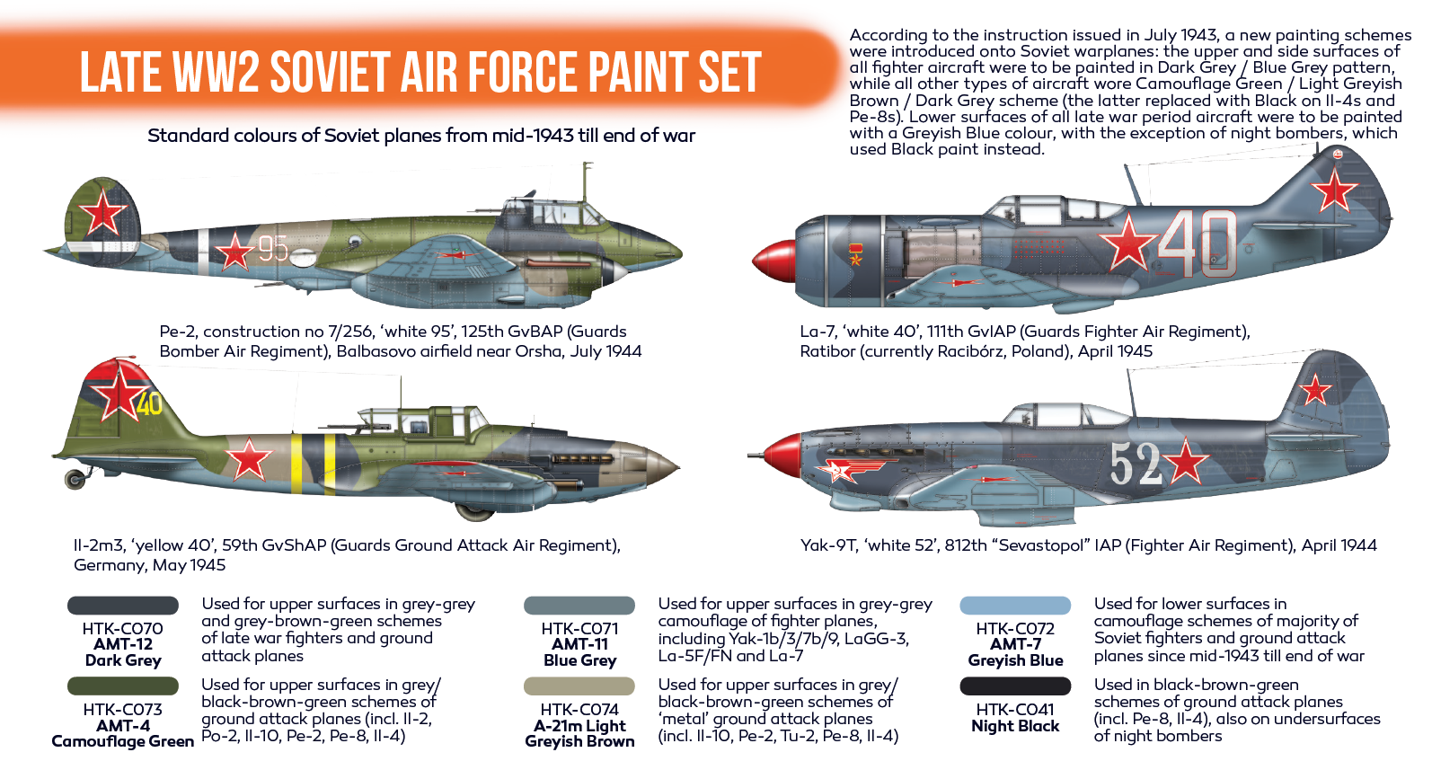 Zestaw zawiera farby emaliowe wyprodukowane przez firmę Hataka przeznaczone do malowania modeli rosyjskich samolotów pochodzących z okresu II Wojny Światowej (1939 - 1945).