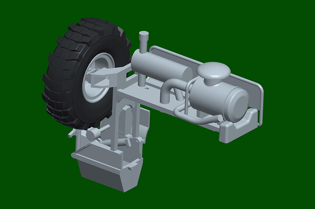> Full drive train assembly complete with engine transmission, differential housing and suspension units.