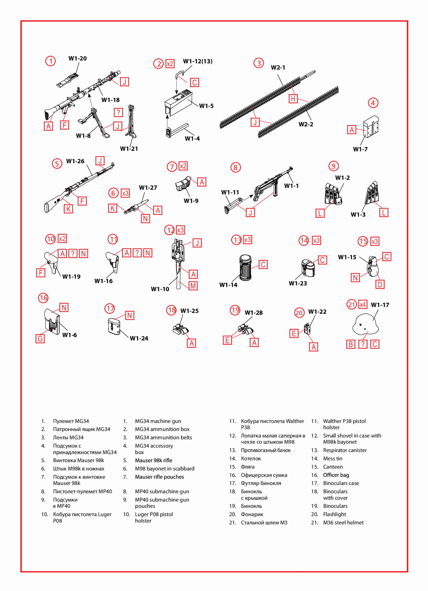 Zestaw zawiera 47 części do montażu broni i sprzętu piechoty niemieckiej z okresu II wojny światowej.