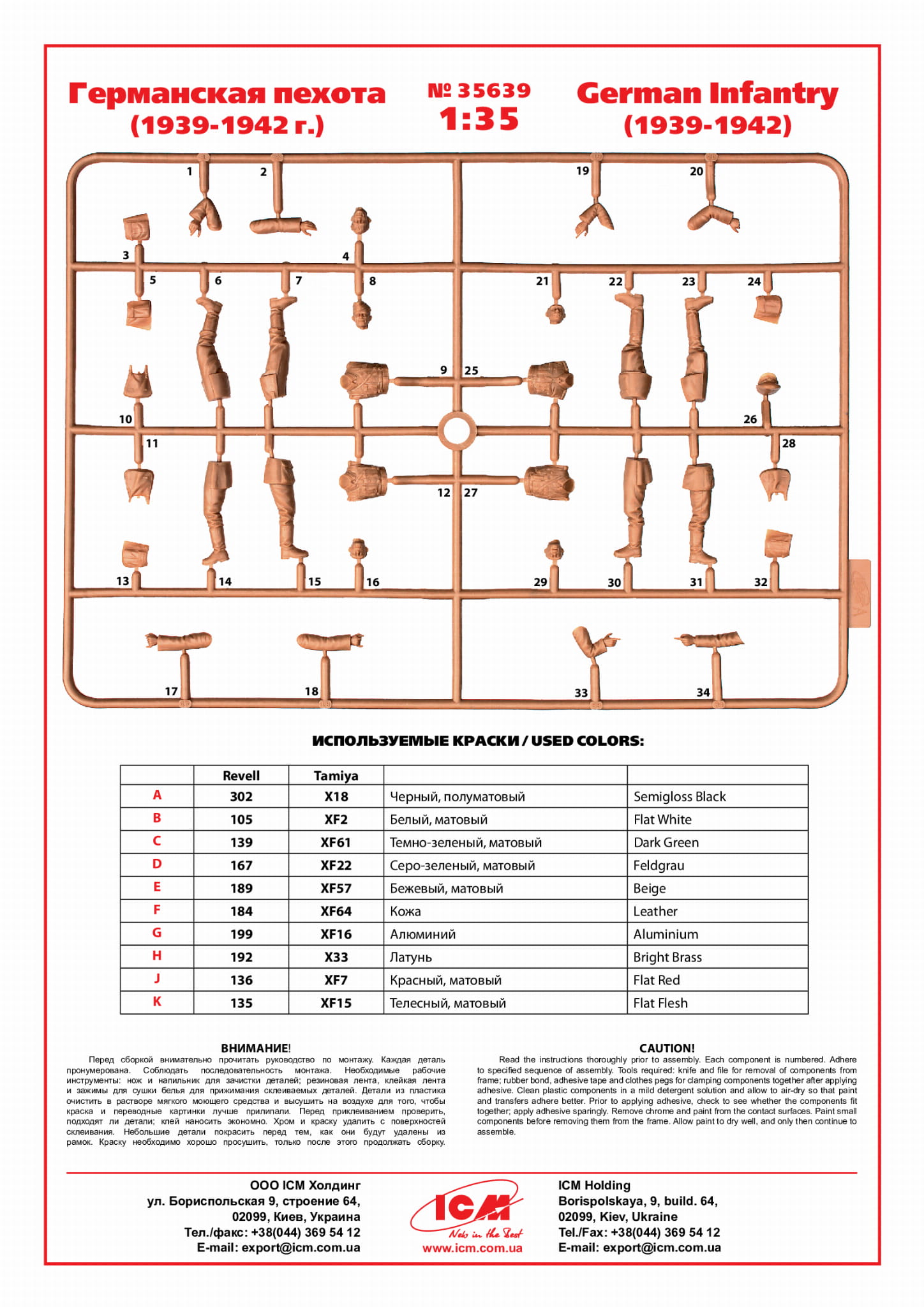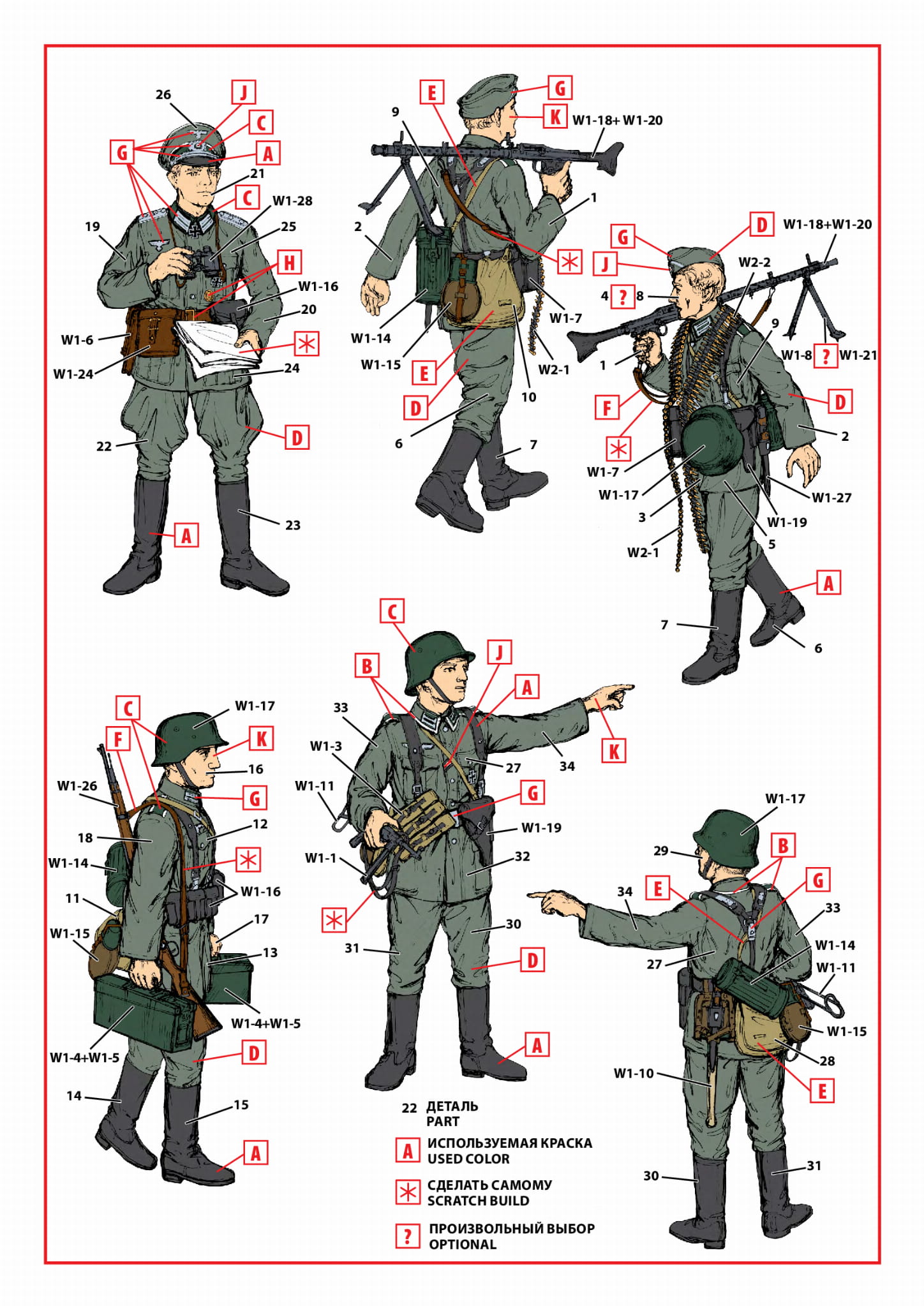 Zestaw zawiera 34+47 części do montażu 4 figurek Piechoty Niemieckiej z okresu 1939-1942.