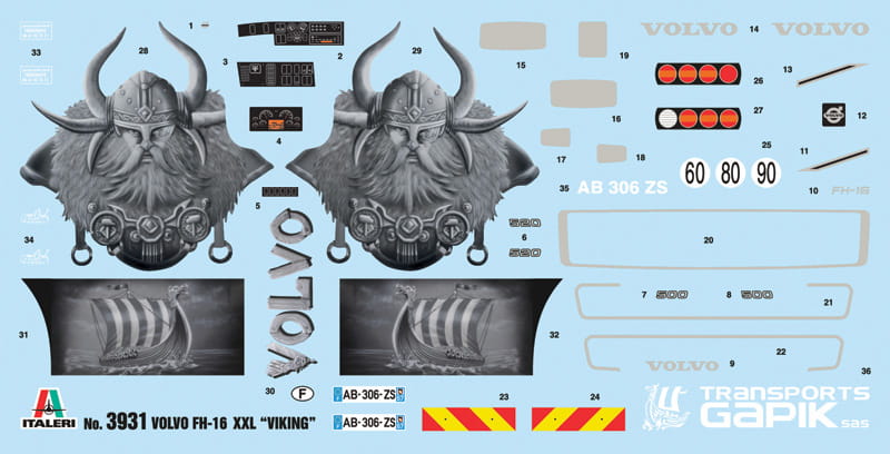 The FH series can be considered a milestone in Volvo industrial vehicle production. Introduced to the market since 2001, it was released in numerous versions and variants. In details, the Volvo FH16 has been the reference version of the Volvo trucks line up. Powered by a 16 liter engine, capable of delivering 610 HP, it was characterized by a good power and low running costs. For those times, Volvo FH16 introduced advanced electronic solutions able to ensure a safer and more comfortable driving even in the long range delivery duties. The FH-16, well-known for its commercial success, has been the basis for many "Show Truck" characterized by impressive and high visibility customized livery. The "Viking" is a good example of Show Truck. The adoption of the bull bar with the grilles to protect the front lights, the installation of additional headlights, the choice of colors and the “Nordic inspired” graphic create a unique truck with a strong personality.