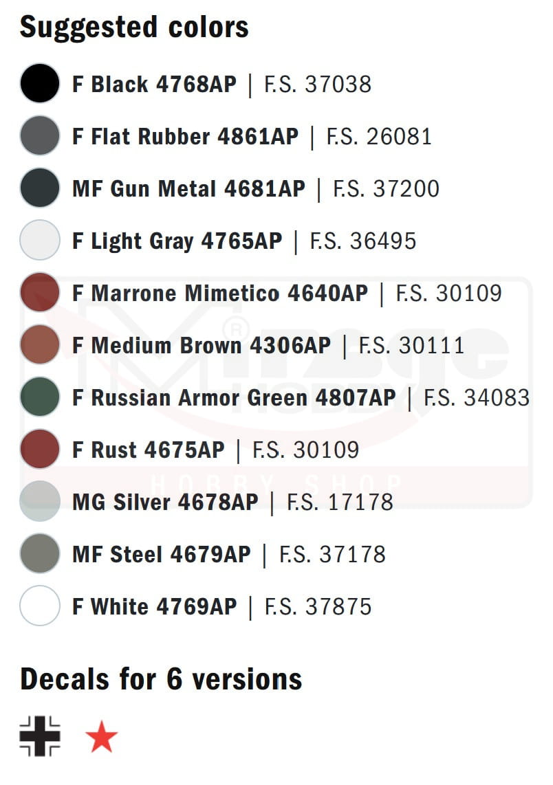 NEW METALLIZED BOX - METAL GUN BARREL - TWO MAIN WHEELS TYPES - DETAILED ENGINE AND TRANSMISSION - GLUABLE RUBBER TRACKS OR LINK-AND-LENGTH - PHOTO ETCHED FRET - DECALS FOR 6 VERSIONS - COLORS INSTRUCTION SHEET