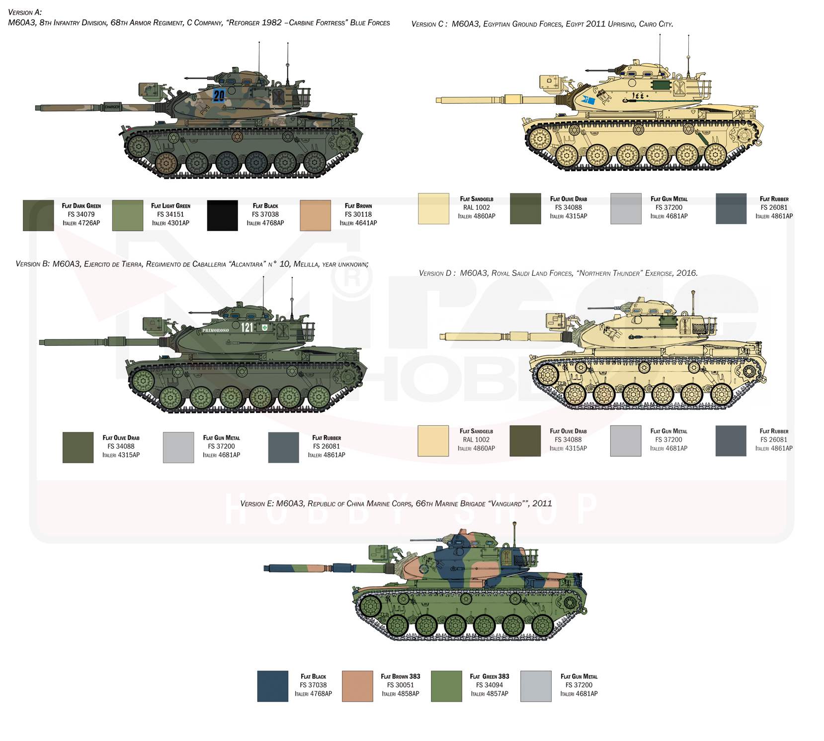 The M-60 was introduced in the first years of ‘60s in the United States Army. It was developed and designed to be the evolution of the famous tanks M-47 and M-48 Patton series. The M-60 became the most important MBT (Main Battle Tank) of the U.S. Army during the Cold War years. It was produced, until 1983, by the American company Chrysler in 15.000 units and it was adopted, in several versions, by the armed forces of numerous countries all over the World. The main armament, installed in the turret, was the 105 mm. M68 gun. The M-60 was characterized by its big size and by the adoption of the powerful V12 turbodiesel engine able to release a good operating performance and a good speed on-road and off-road. It was deployed in a lot of conflicts and operational scenarios. In 1976 the new upgraded M60A3 version was developed and it was characterized by several improvement able to enhance the operation effectiveness. The armor protection for the turret was increased and a new gun mantle was designed. Great improvement in the adoption of modern electronic and fire control systems on board.