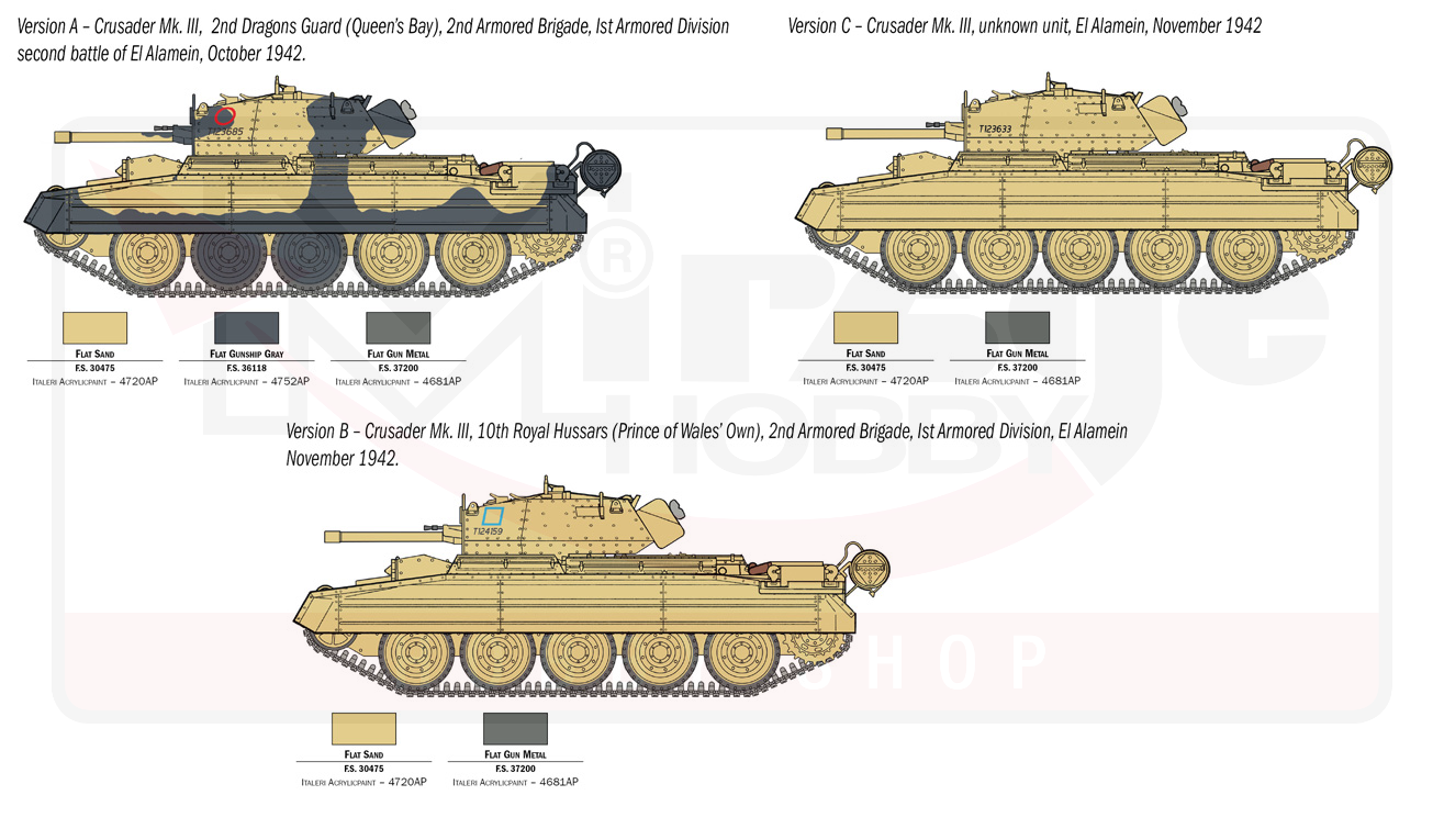Designed at the beginning of the Second World War, the Crusader was one of the most important British "Cruiser" tanks reaching a production of over 5,000 units. Equipped with Christie suspension with large diameter rolling wheels, the Crusader possessed remarkable driving skills on rough terrain. The first versions of Mk. I and Mk. II were armed with a 2 pdr cannon. later replaced by the more powerful 6 pdr cannon. in the Mk.III version. Lacking adequate armor against enemy fire, it was also very vulnerable to enemy mines and anti-tank guns, and its armament was often inadequate in front of similar German vehicles. However, when used in a coordinated way, they managed to achieve good results.