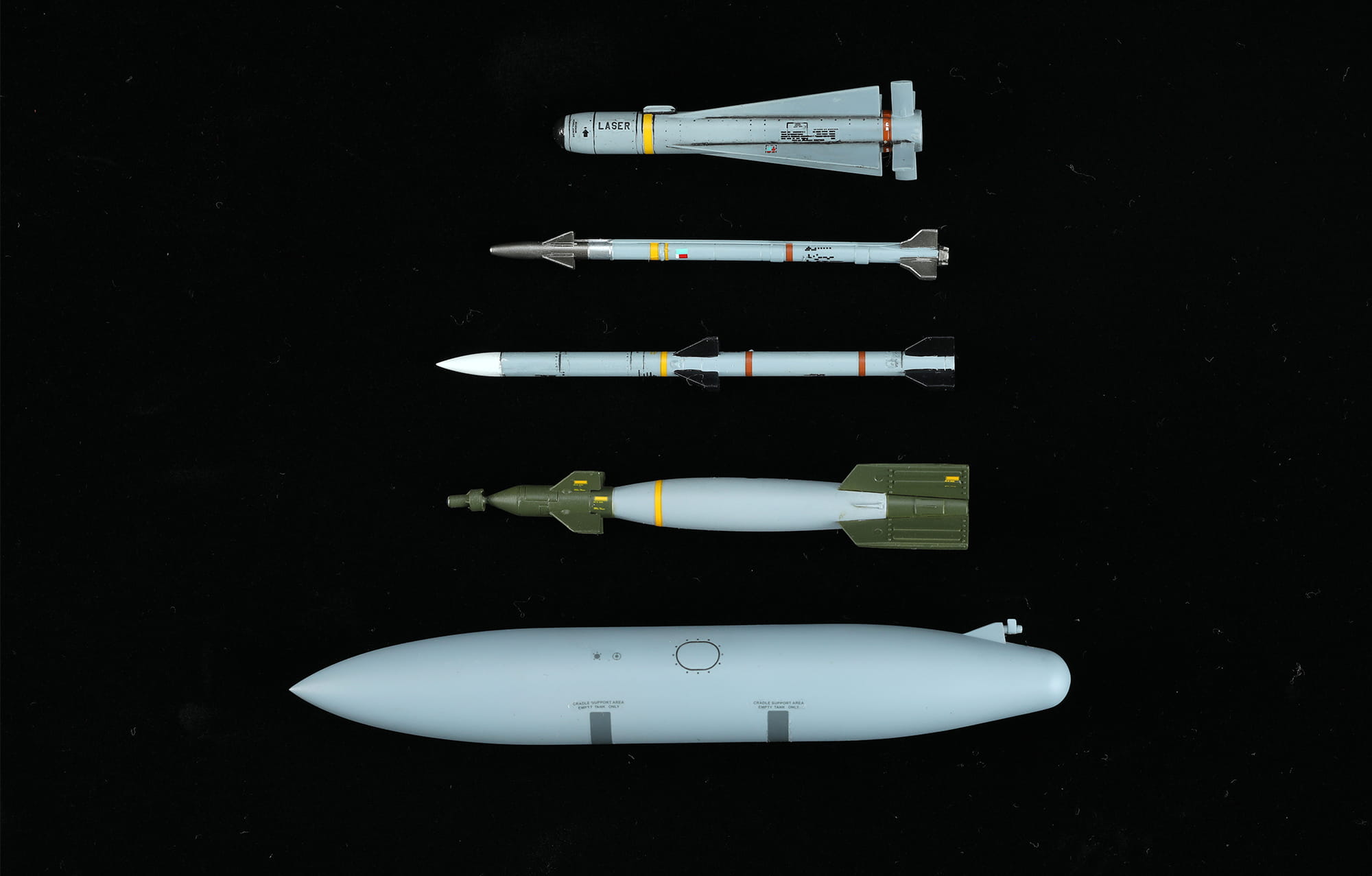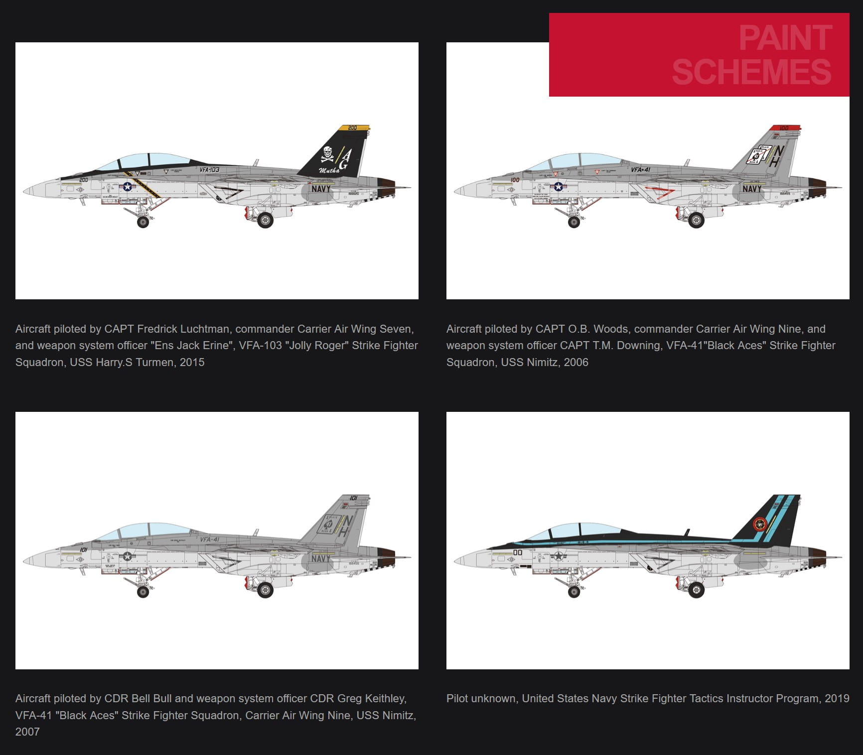 This MENG LS-013 1/48 Boeing F/A-18F Super Hornet model kit accurately reproduces the exterior features and details of the real aircraft. Flaps and slats can be installed in retracted or deployed positions. Horizontal stabilizers and rudders are movable. The cockpit and its interior equipment are precisely replicated. The specially designed pluggable main pylons allow the easy change of weapons; this kit includes AGM-65 anti-radiation missiles and GBU-16 laser-guided bombs. This kit includes two U.S. Navy pilot figures, pre-cut stainless steel PE parts and pre-cut painting masks. This kit provides four paint schemes.