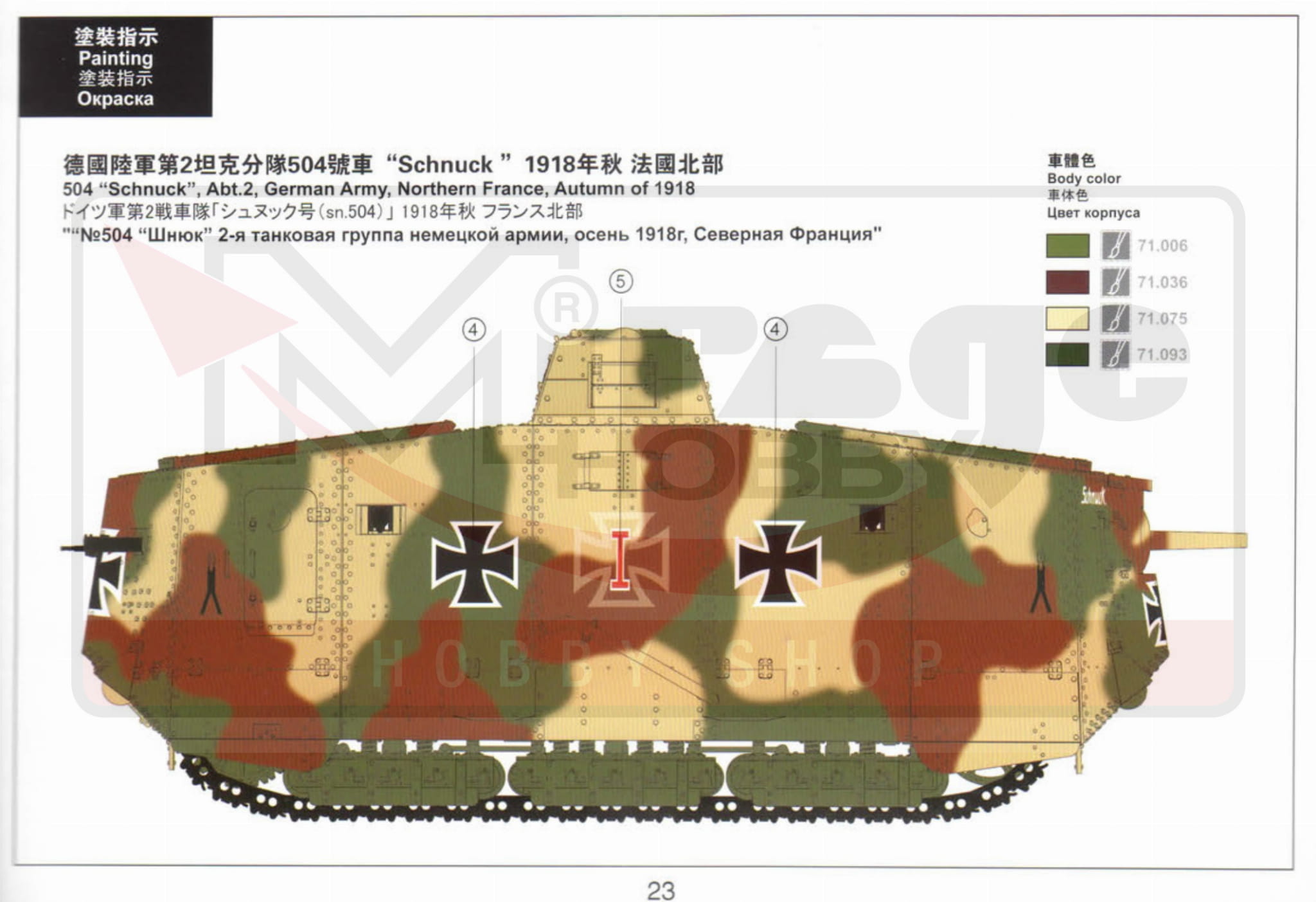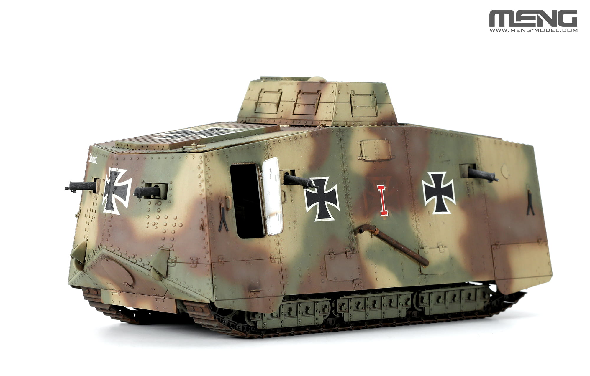 The huge Moving Fortress, A7V tank, is realistically reproduced. The unique Krupp riveted hull is perfectly replicated.