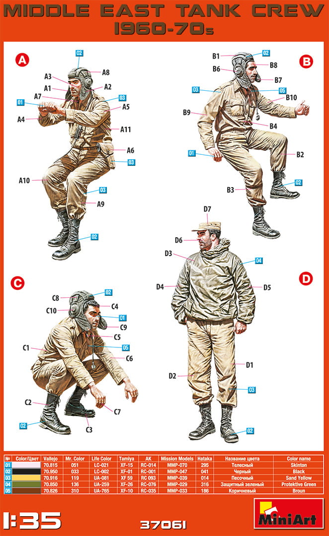 Zestaw zawiera modele czterech figurek do sklejenia i pomalowania załogi czołgu BLISKIEGO WSCHODU z lat 1960-70.