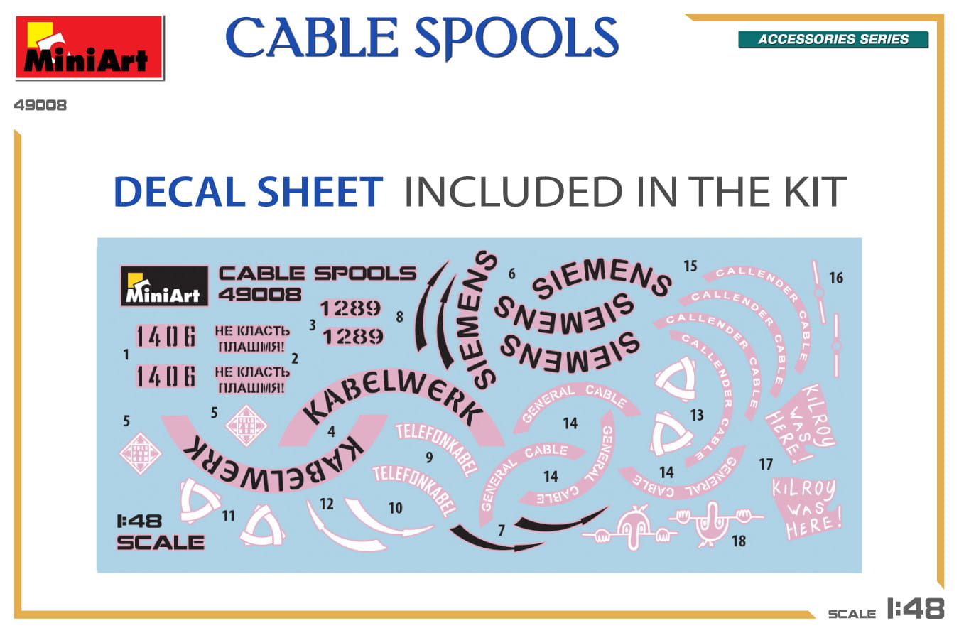 Kit contains unassembled plastic model of 8 Cable Spools with 20 Decal options.
