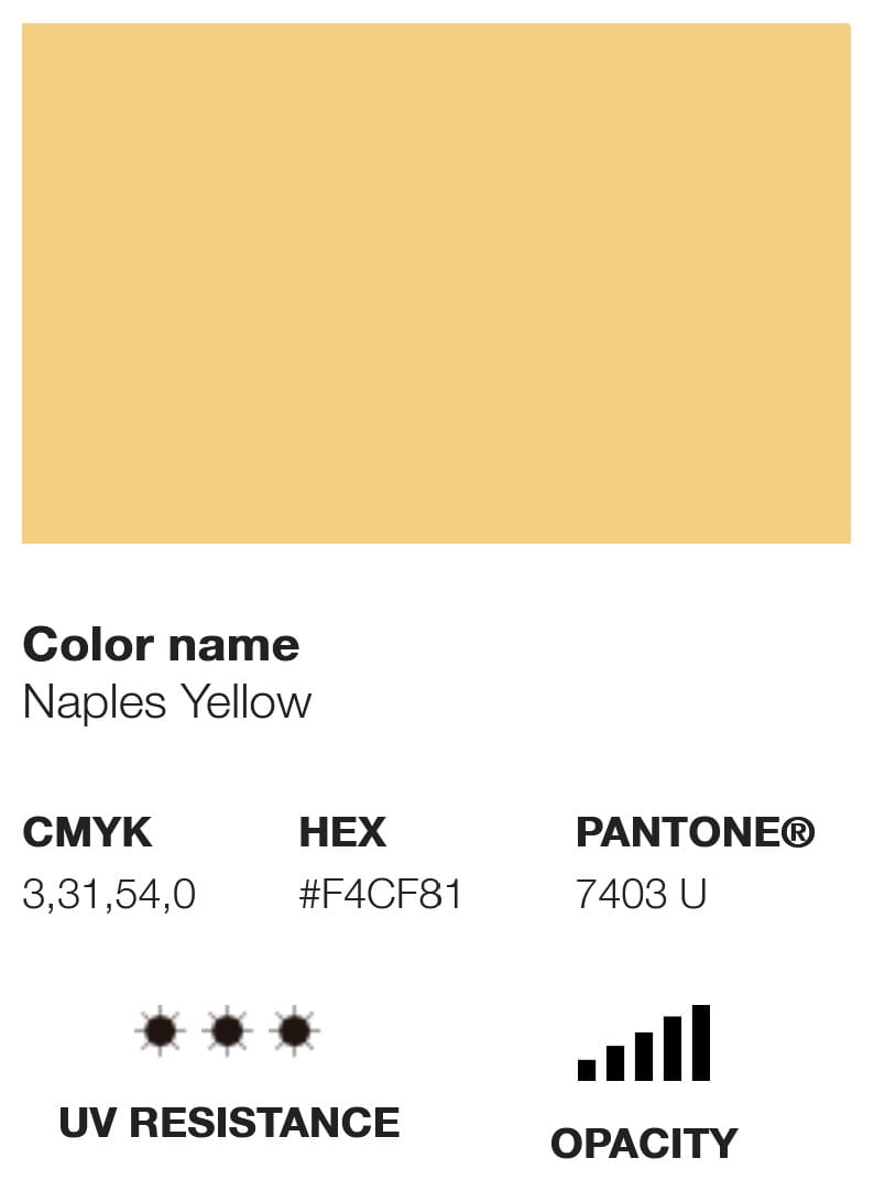Etykieta farby wyświetla swój odpowiednik koloru w różnych opcjach chromatycznych, takich jak Pantone, RGB i CMYK, a także inne informacje techniczne, takie jak poziom krycia, U.V. odporność i kod pigmentu, który wykorzystuje.