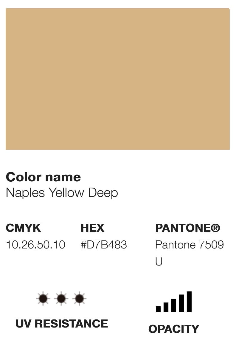 Etykieta farby wyświetla swój odpowiednik koloru w różnych opcjach chromatycznych, takich jak Pantone, RGB i CMYK, a także inne informacje techniczne, takie jak poziom krycia, U.V. odporność i kod pigmentu, który wykorzystuje.