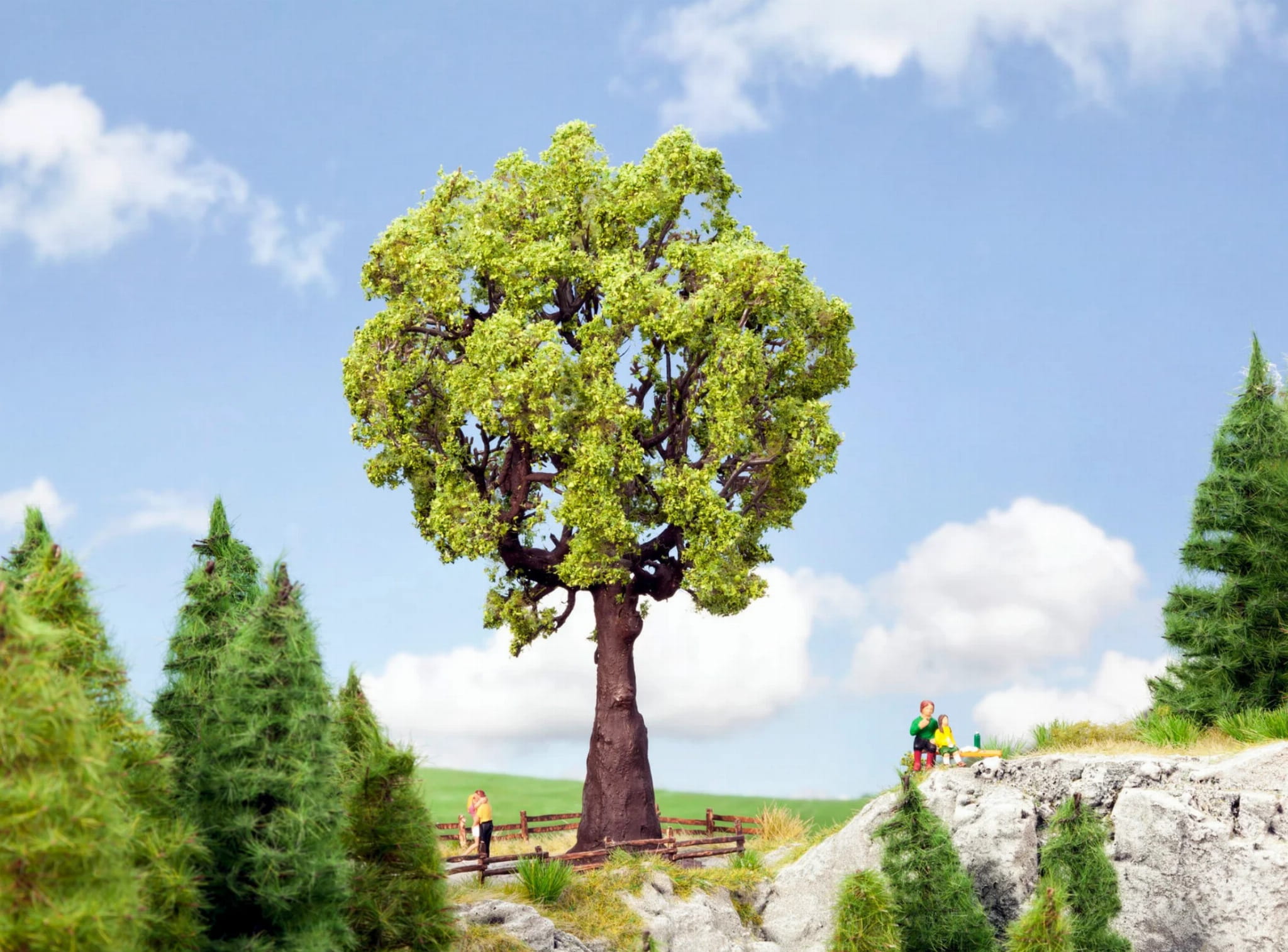 Czy wiesz, że brzozy dorastają do 30 metrów wysokości, a lipy nawet do 40 metrów? W skali H0 brzoza miałaby wtedy do 34 cm wysokości; lipa nawet do 50 cm. Nawet jeśli byłoby to trochę zbyt dobre dla standardowego modelu krajobrazu, najwyższy czas na wyższe drzewa! Ponieważ z tych szczególnie imponujących, samodzielnych okazów można zaprojektować piękne sceny modelowe.