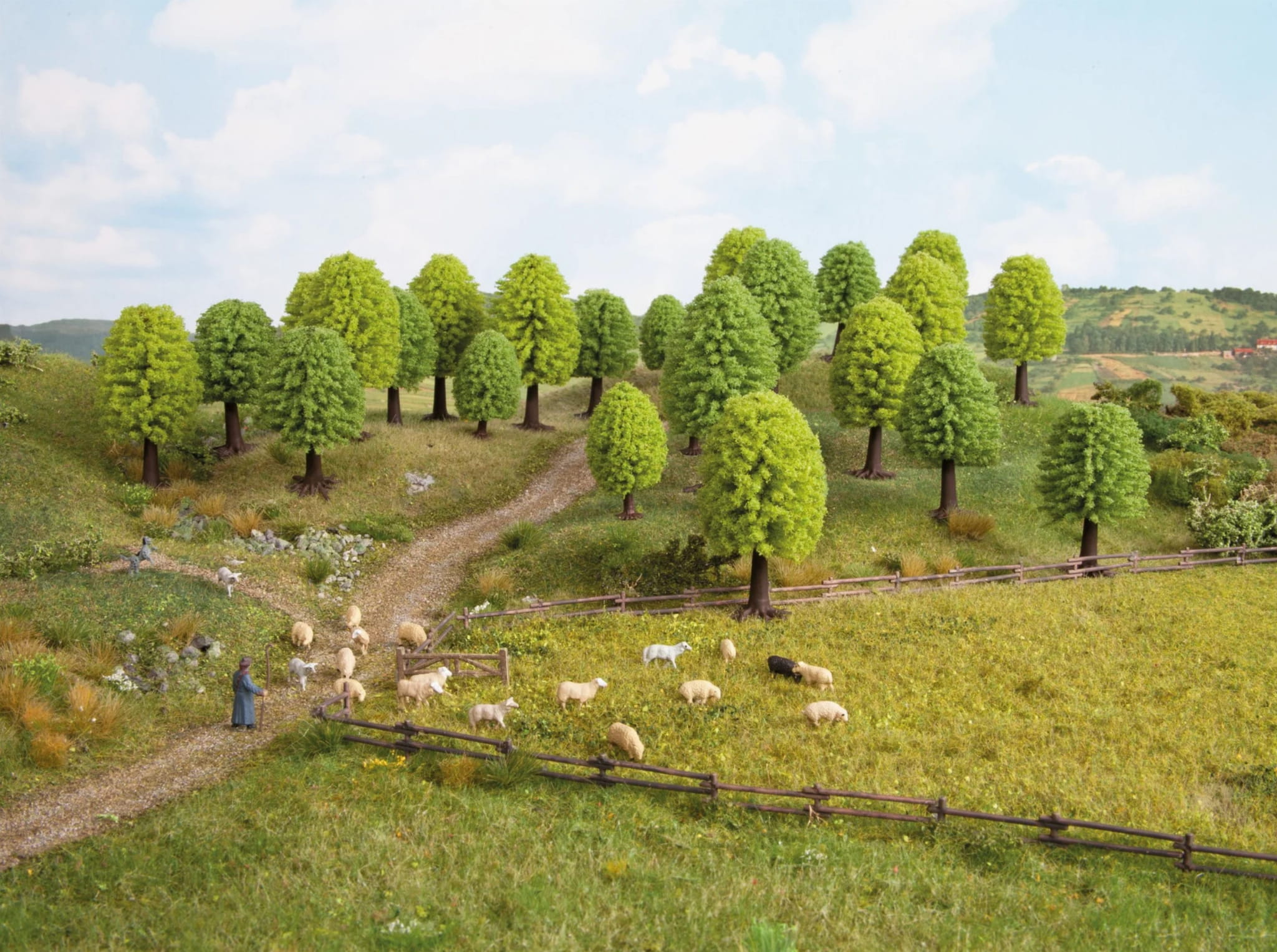 „Drzewa liściaste” NOCH są idealne do odtwarzania wysokiej jakości, realistycznych scen krajobrazowych na modelowym krajobrazie. Lasów w prawdziwym życiu jest bardzo dużo i nie powinno ich zabraknąć również w modelowym krajobrazie. Niezależnie od tego, czy są to drzewa liściaste, jodły, świerki, modrzewie czy drzewa śródziemnomorskie, najróżniejsze gatunki drzew sprawiają, że scena krajobrazowa jest jeszcze bardziej realistyczna i idylliczna. Leśne zwierzęta szukają schronienia pod wysokimi drzewami, a przy ładnej pogodzie ludzie przechadzają się po gęstym lesie. Odtwórz idylliczne krajobrazy z „drzewami liściastymi” wśród drzew standardowych i przyciągnij wzrok swoim układem.