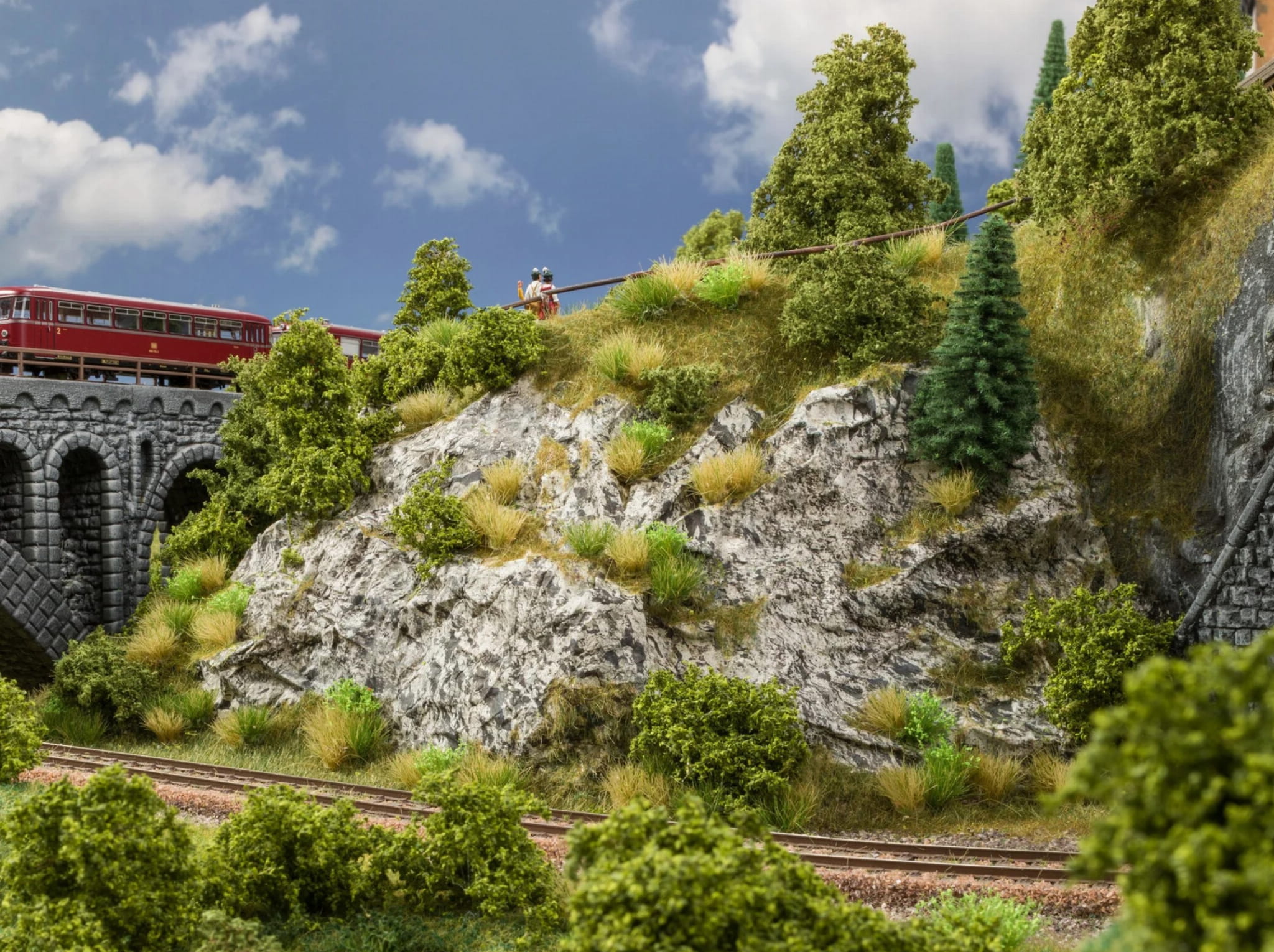 Wrinkle Rocks ułatwiają tworzenie superrealistycznych formacji skalnych w mgnieniu oka. Fotorealistyczne skały są drukowane na specjalnym papierze, który jest niezwykle wytrzymały, a jednocześnie łatwo się marszczy. Tylko nie bój się: im bardziej szaleńczo i gwałtownie się marszczysz, tym drobniejsze stają się struktury w skale. I wygląda naprawdę dobrze! Dopasowanie go do krajobrazu jest niezwykle łatwe. Pomarszczoną taflę skały można łatwo przykleić do krajobrazu za pomocą kleju NOCH Landscaping Glue (ref. 61133). Arkusz można łatwo wygiąć nad terenem. NOCH Wrinkle Rocks zostały opracowane we współpracy z Andreas Dietrich Modeling Studio w Austrii. Kilka lat temu Andreas Dietrich wynalazł oryginalne Wrinkle Rocks i zarejestrował je jako znak towarowy.