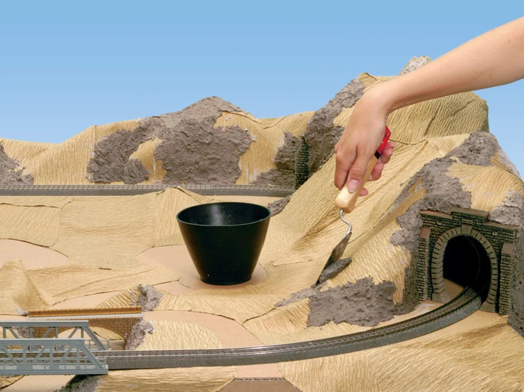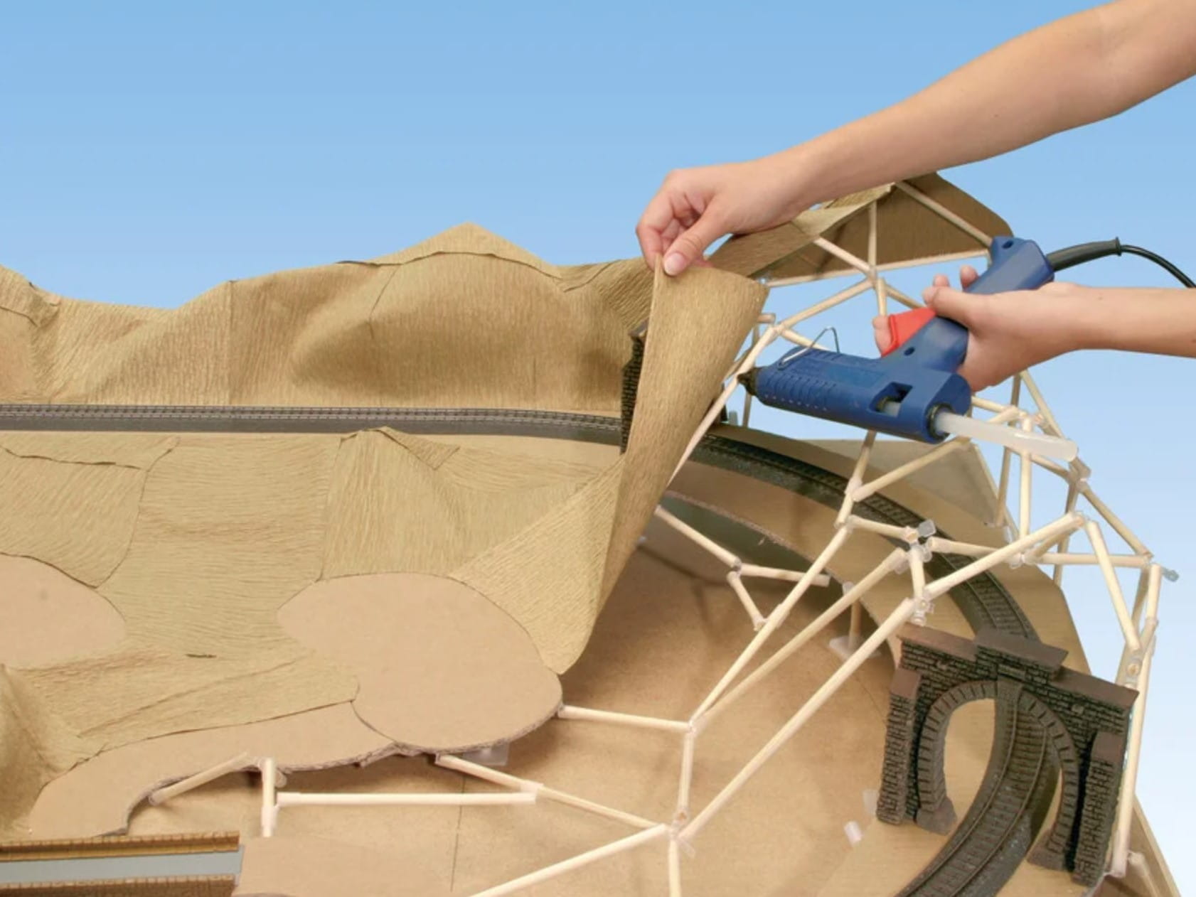 Początek każdego modelowego krajobrazu zaczyna się od podkonstrukcji. To tutaj powstaje później podstawa wysokiej jakości krajobrazu. Niezależnie od tego, czy są to płaskie pola, wysokie góry, czy małe wzgórza, krajobraz tworzy się za pomocą „Papier krepowy krajobrazowy”. Produkt idealnie nadaje się do modelowania i tworzenia realistycznych krajobrazów w kilku krokach. Dzięki przepuszczającej wodę warstwie środkowej, materiały o niskiej lepkości można bez problemu stosować do projektowania. Ze względu na swoją elastyczność i sprężystość papier krepowy można optymalnie dopasować do każdego kształtu.