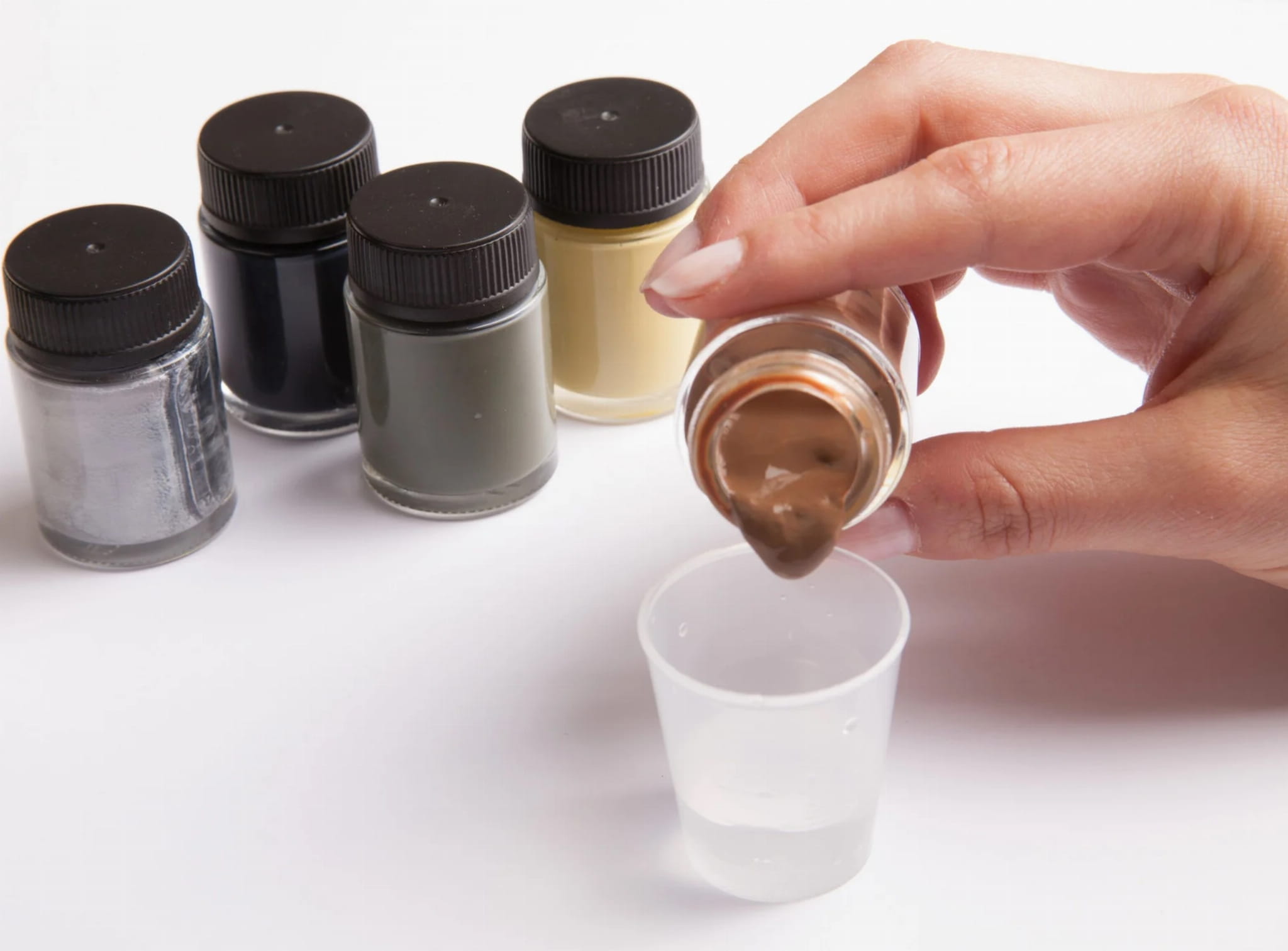 Zestaw Nature Paints zawiera 20 ml silnie skoncentrowanej farby w sześciu różnych odcieniach: beżu, ochry, oliwki, ziemistego brązu, szarości i czerni.