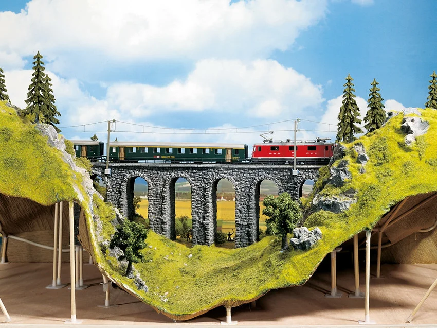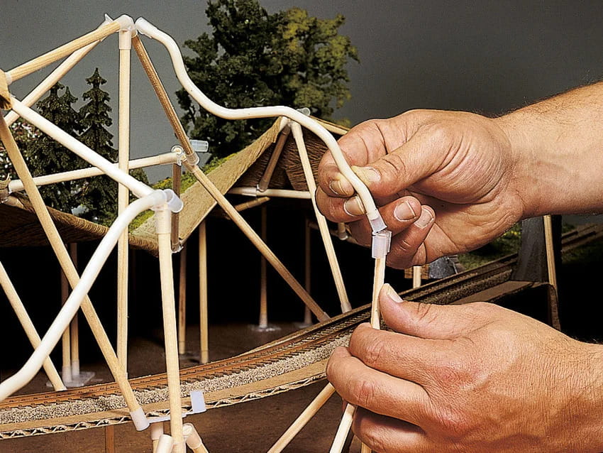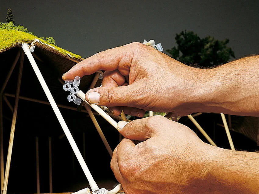 Po jeździe próbnej zaczynasz projektować krajobraz – wokół układu toru. Pierwszą rzeczą, którą robisz, jest ustawienie ramy podobnej do namiotu. Ponieważ okrągłe słupki są wkładane tylko do elementów łączących, konstrukcja może być w każdej chwili korygowana i zmieniana. Dzięki temu systemowi ramowemu późniejsze przeprojektowanie jest tak samo łatwe, jak bieżąca „konserwacja” szyn i całej technologii. Gdy konstrukcja jest już na miejscu, jest następnie pokrywana papierem krepowym NOCH i tworzy teraz „pusty teren”, który możesz dalej rozwijać zgodnie z własnymi życzeniami.