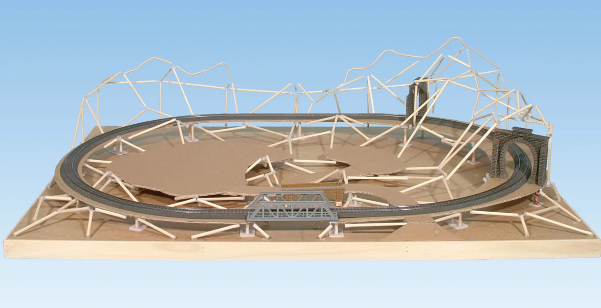 Po jeździe próbnej zaczynasz projektować krajobraz – nad i wokół układu torów. Pierwszą rzeczą, którą robisz, jest ustawienie struktury przypominającej namiot. Ponieważ okrągłe słupki są wkładane tylko w elementy łączące, konstrukcję można w każdej chwili poprawić i zmienić. Dzięki temu systemowi ramowemu późniejsze przeprojektowanie jest równie łatwe, jak bieżąca „konserwacja” szyn i całej technologii. Kiedy rama jest na swoim miejscu, jest następnie pokryta bibułą krepową NOCH Landscape i tworzy teraz „pusty teren”, który możesz dalej rozwijać zgodnie z własnymi życzeniami.
