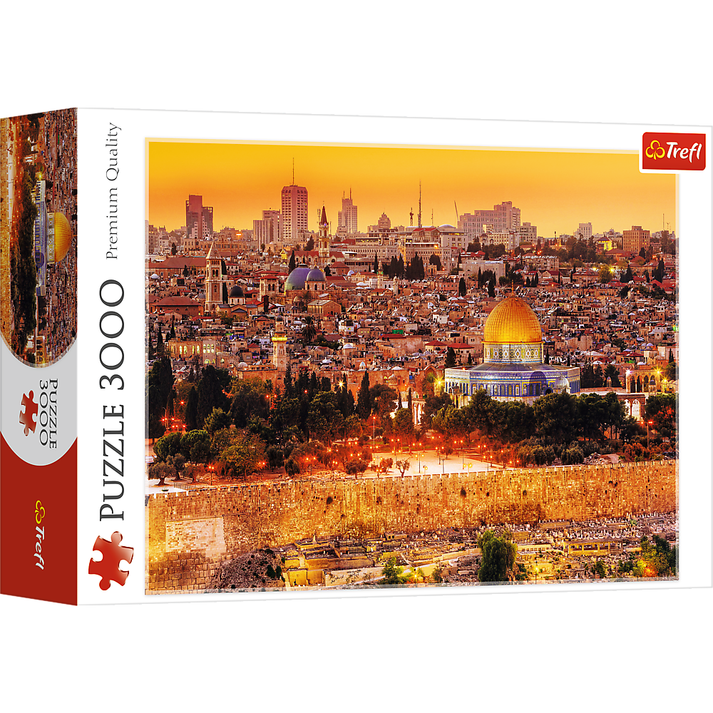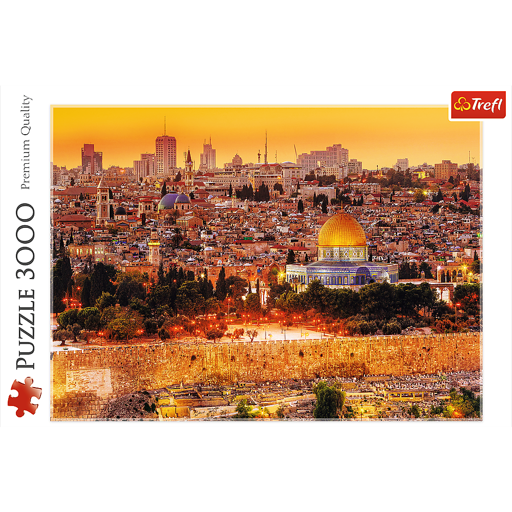Puzzle 3000 elementów z widokiem na dachy Jerozolimy. Po ułożeniu powstanie obrazek o wymiarach 116x85cm. Wysoką jakość, nasycenie kolorów i bezpieczeństwo układania zapewnia wykorzystanie materiałów ekologicznych.
