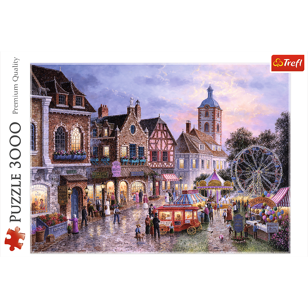 Puzzle 3000 elementów przedstawiające uroczy obrazek wesołego miasteczka z dawnych lat. Po ułożeniu powstanie obrazek o wymiarach 116x85cm. Wysoką jakość, nasycenie kolorów i bezpieczeństwo układania zapewnia wykorzystanie materiałów ekologicznych.