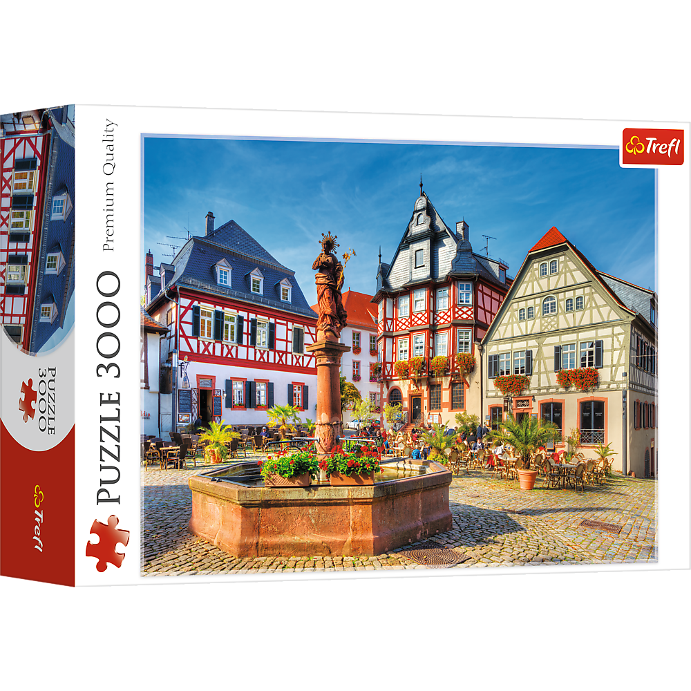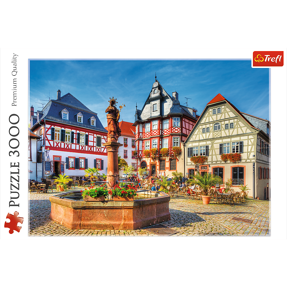 Puzzle 3000 elementów z obrazem przedstawiającym malowniczy rynek w Heppenheim. Po ułożeniu powstanie obrazek o wymiarach 116x85 cm. Wysoką jakość, nasycenie kolorów i bezpieczeństwo układania zapewnia wykorzystanie materiałów ekologicznych.