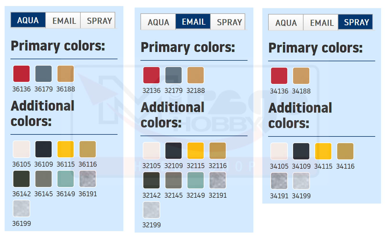 Producent do pomalowania tego modelu rekomenduje następujące farb modelarskie: